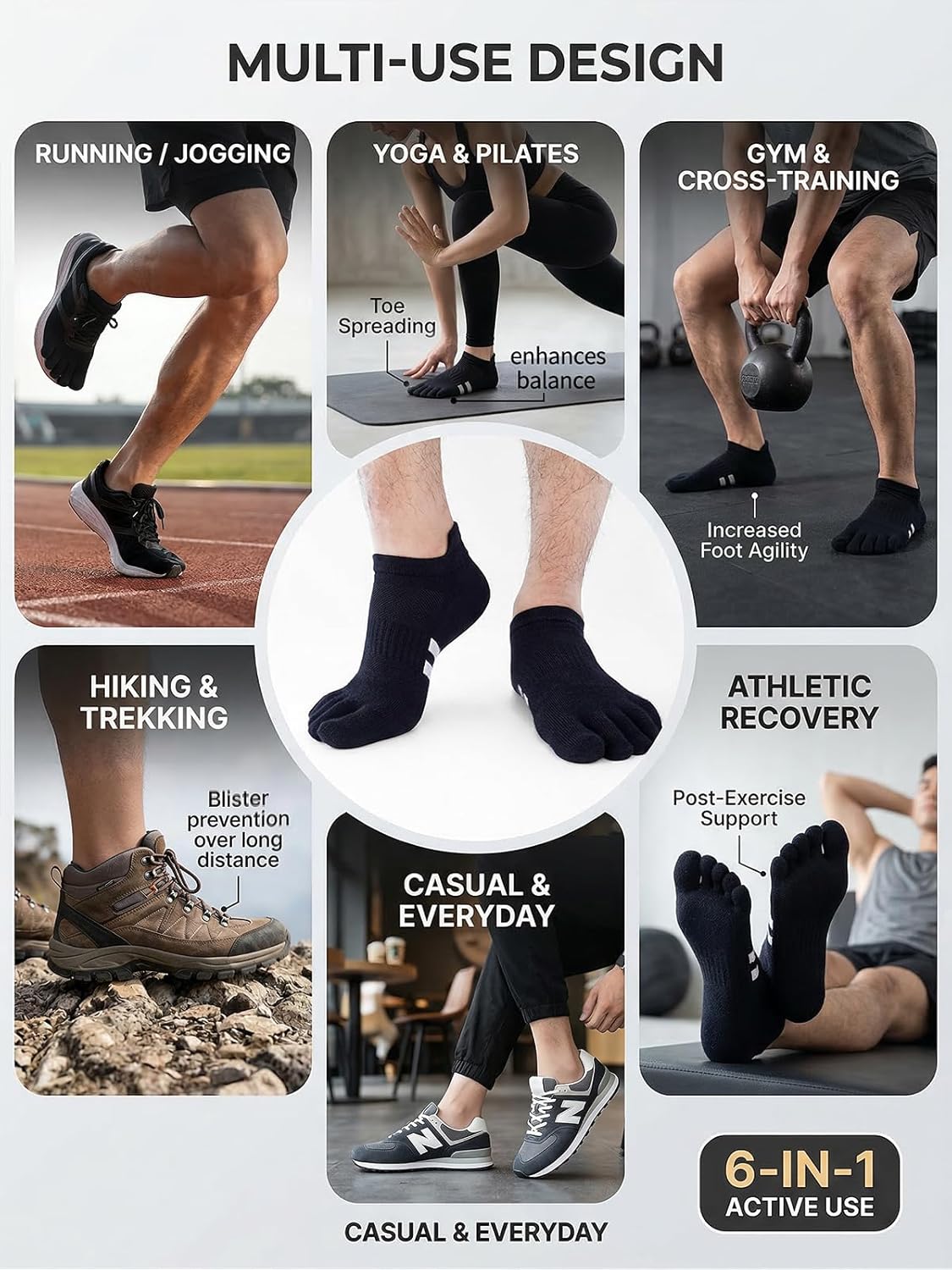 SIZE & NOTICE Medium(Mens: 4 - 8.5/Womens: 5 - 9),Large(Mens: 9 - 11/Womens: 9.5 - 12) Wash inside out with similar colors.The water temperature should not exceed 40°C or 105°F.Please do not iron or tumble dry. Wool socks for men can develop pilling over time due to wool fiber properties and friction.Reduce pilling by following care instructions,minimizing friction,and using a fabric shaver or scissors to remove pills if they form. If you are not satisfied with our products,please contact us immediately,we will give you the best service. Arch Support for Stability These merino wool hiking socks offer extra arch support to help maintain proper foot posture,reduce foot fatigue,and enhance overall comfort and balance,making them ideal for both active days and long hours on your feet at work. ULTIMATE COMFORT Five-Toe Separated Design keeps every step smooth—whether you're running,hiking,or training. Occasions Merino Wool low cut socks can be worn as ankle athletic toe socks,running toe socks,hiking toe socks,fitness toe socks and casual toe socks.When you wear them to play golf,tennis,cycling and walking,they may even help you enhance your performance. When your heart rate rises and sweat kicks in,you need a wool toe socks that support your workout—not slow you down.The wrong pair can cause hot spots,blisters,and damp feet.Ours are form-fitting,breathable,and Lightweight to keep you dry,comfortable,and moving strong. When summer temps say no,these socks say hell-to-the-yes.Our ultra-lightweight no show wool running sock wicks moisture and keeps the air flowing for skin-friendly feet,keeping you dry and cool and your strides blister-free.