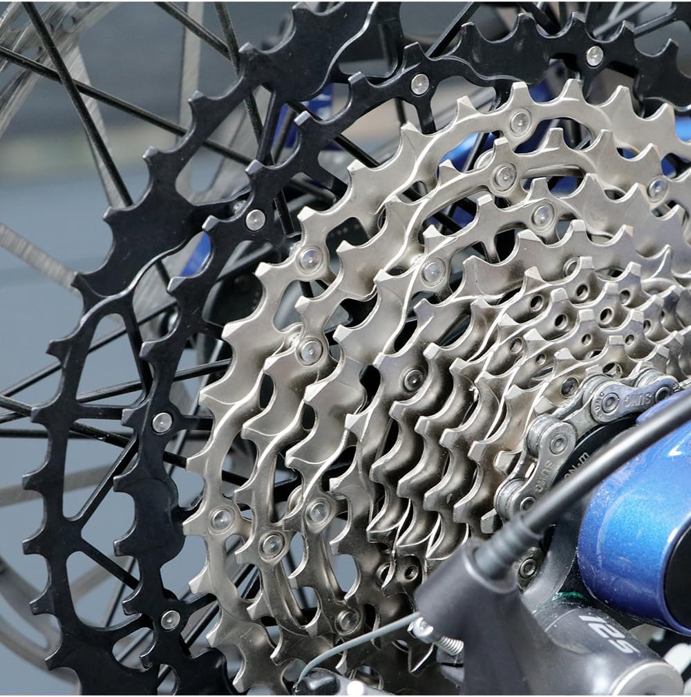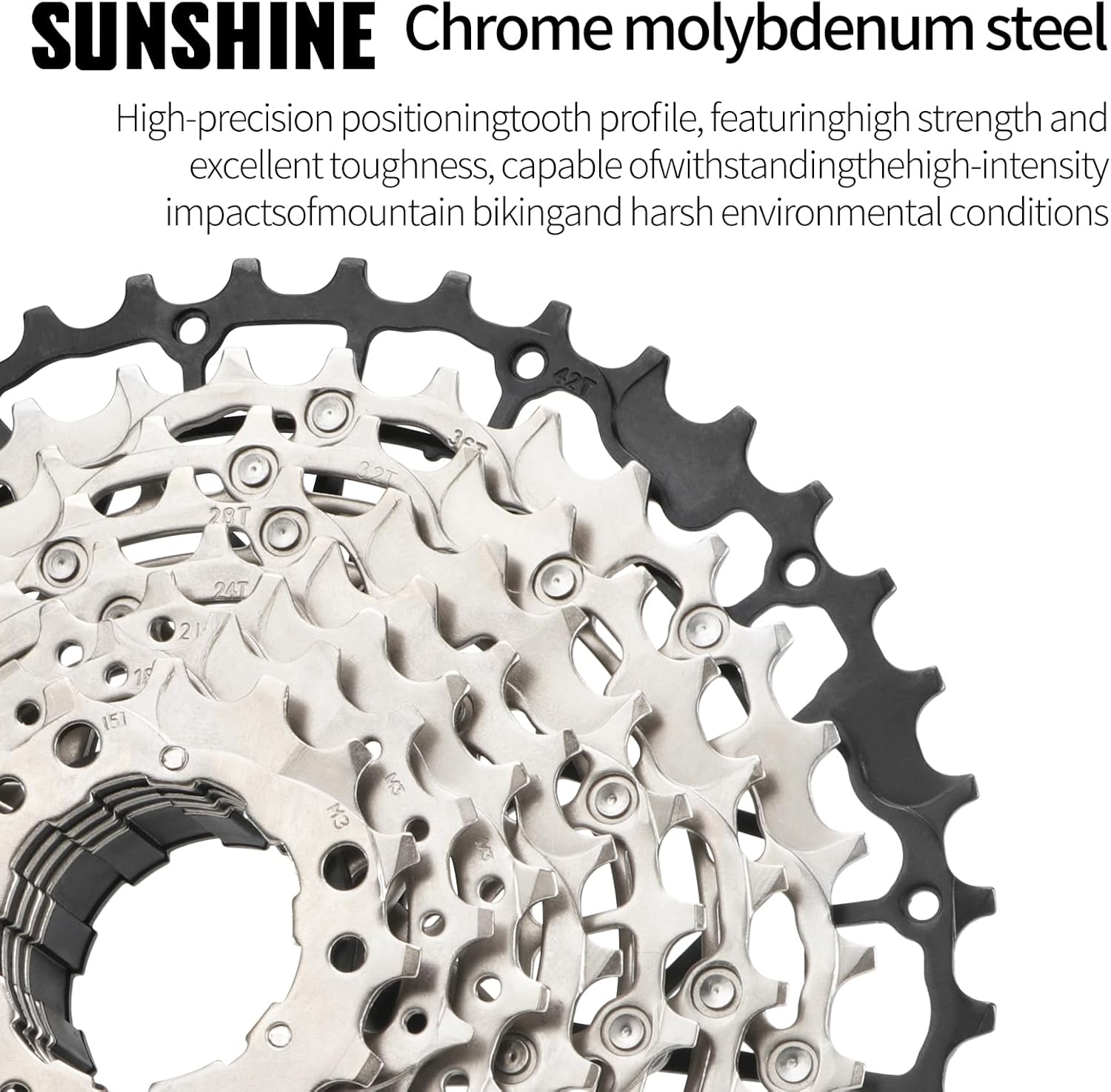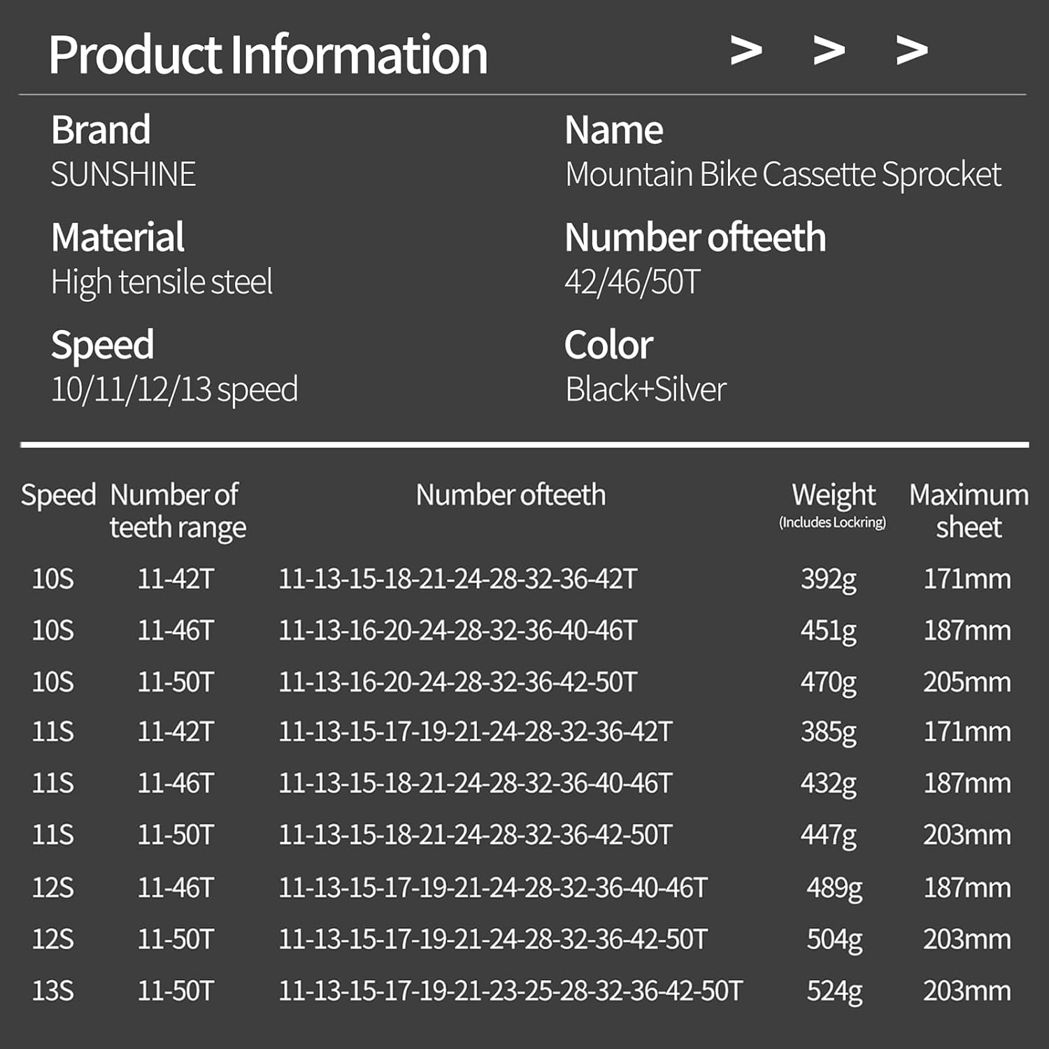 Dominate the Trails with Unstoppable GearingThe SUNSHINE MTB Cassette redefines reliability for demanding riders. Crafted from triple-plated chromoly steel, each 42T-50T sprocket withstands rock strikes, mud immersion, and high-torque pedaling while maintaining razor-sharp shifting.Why Riders Choose This Cassette:Smart Weight Savings: Large CNC-cut windows reduce rotational mass (see weight chart by speed) while accelerating debris clearanceFlawless Drivetrain Sync: 11-13T small cogs and ramped 42-50T climbing gears create progressive steps (e.g., 11-50T: 11-13-15-18-21-24-28-32-36-42-50T). Zero-Hassle Installation: Slide onto HG hubs in minutes.Tested Toughness: Chromium-molybdenum steel material, high strength, wear resistance, and fatigue resistance. Handles extreme loads for reliable trail performance.Specs That Matter: Colors: Black+Silver Max Cog: 42T/46T/50T (see speed-specific weights) Diameter: 171mm (42T) to 205mm (50T) Material: Chromoly