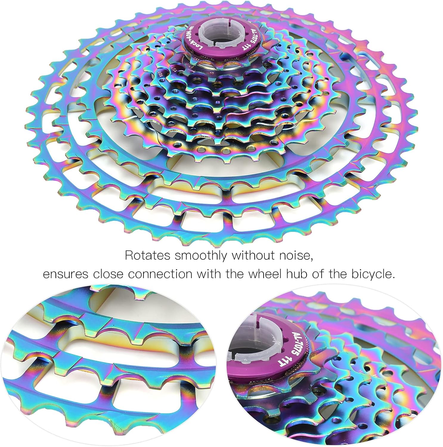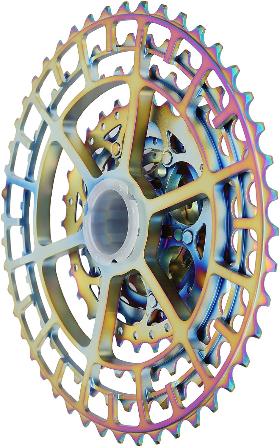 [HIGH PERFORMANCE 10 SPEED CASSETTE] This 10 speed bike cassette flywheel features an 11 13 15 18 21 24 28 34 40 46T teeth ratio designed for smooth and efficient gear shifting. Perfect for mountain biking and other demanding terrains.[LIGHTWEIGHT HOLLOW DESIGN] The hollow design of this colorful freewheel significantly reduces weight without compromising durability. Enjoy a lighter ride while maintaining robust performance on any trail.[SMOOTH AND QUIET OPERATION] Engineered for seamless rotation this flywheel ensures a noise free ride. Its precise construction guarantees a close connection with your bike's wheel hub for effortless pedaling.[DURABLE METAL CONSTRUCTION] Made from high quality aluminum alloy and steel this cassette is built to last. It resists corrosion and handles heat from friction ensuring long term reliability even under heavy use.[EASY INSTALLATION] Designed for convenience this cassette freewheel can be easily installed to replace your old or damaged one. Simply follow the instructions and enjoy a hassle free upgrade for your bike.Spec:Item Type: 10 Speed Cassette Flywheel Material: Aluminium Alloy+SteelColor: ColorfulTeeth Ratio: 11-13-15-18-21-24-28-34-40-46TWeight: Approx.451g/15.9ozPackage List:6 x Sprocket1 x Flywheel Cover1 x GasketNote:Check whether the flywheel is locked and aligned after installation.