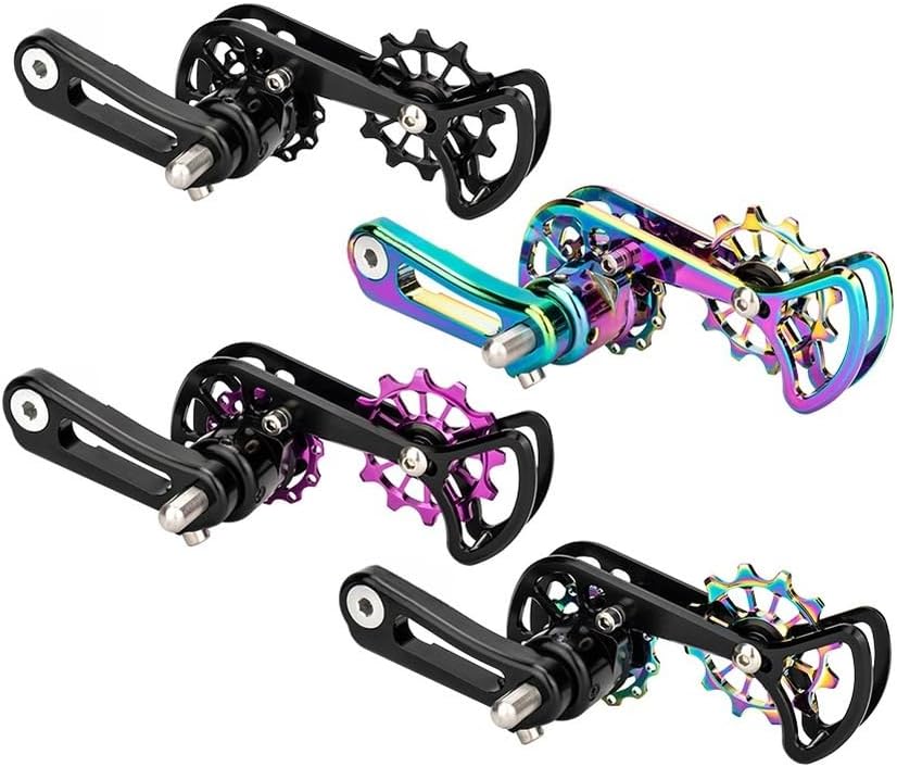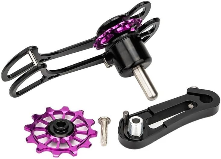 Features:*CNC Machined Construction: Features precision aluminum alloy build for exceptional durability and high strength performance.*Chain Tension Adjustment: Allows precise alignment and tension control to maintain optimal chain stability during riding.*Single Speed Compatibility: Designed specifically for single speed setups to prevent chain drops in aggressive trail conditions.*Installation Requirements: Fits all frames with rear derailleur hangers including full suspension and hardtail mountain bikes.*High Performance Application: Ideal for AM and for DH riding styles that demand reliable chain retention on technical terrain.Specifications:*Product Name:Bike Single Speed Chain Tensioner*Material:metal*Color:Black, Black + Purple, Black + Multicolor, Multicolor*Size: Width 69mm (as shown)Package Content:1* Chain Tensioner