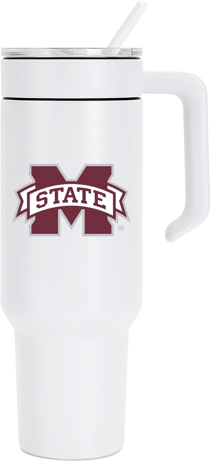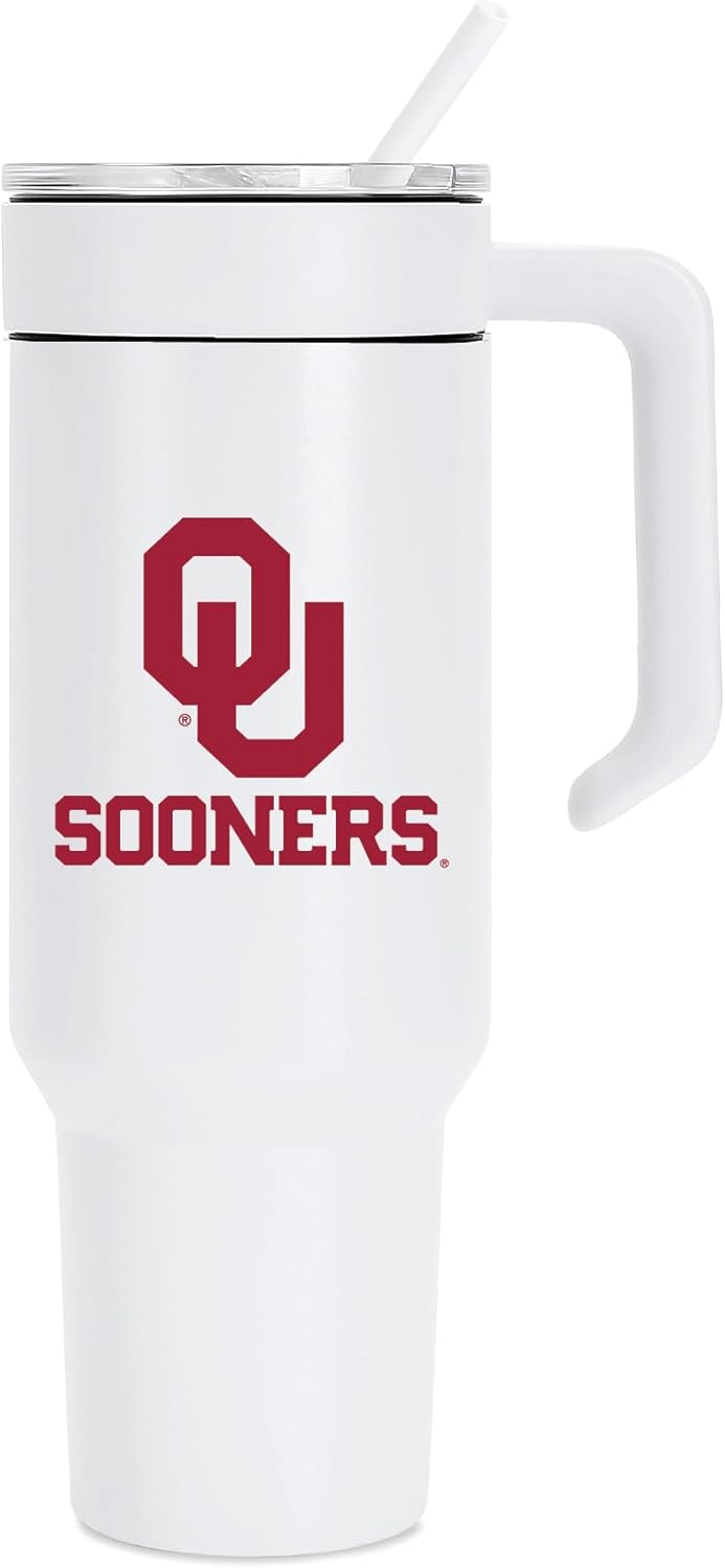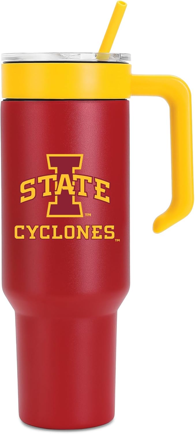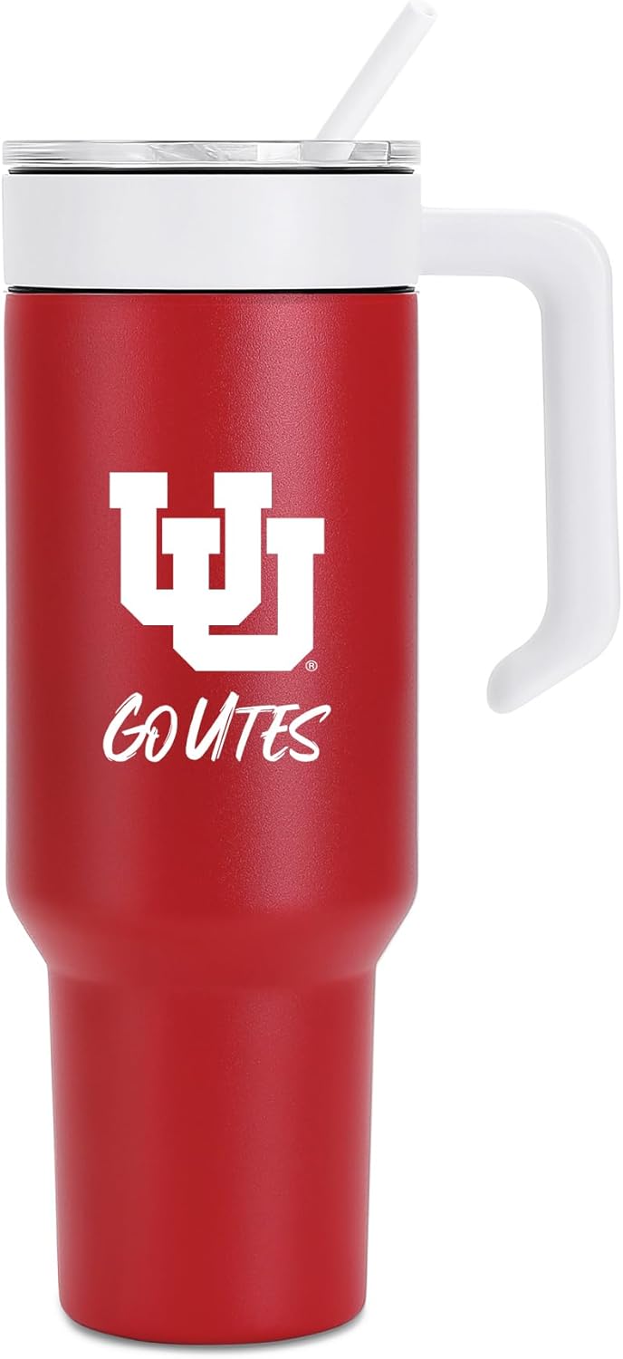 Enjoy your favorite beverages in style with this versatile double-wall stainless steel tumbler. Copper-lined and vacuum insulated, it keeps drinks cold for hours while preventing condensation on the exterior. The removable handle allows you to switch between a 48oz or streamlined 40oz tumbler, and the secure screw-on lid ensures a spill-resistant experience. Featuring a bold powder-coated finish, a vibrant design, and a color-coordinated flexible silicone straw, it’s as stylish as it is functional. Perfect for everyday use, tailgates, sporting events, or travel, this tumbler combines performance and flair in one convenient package.