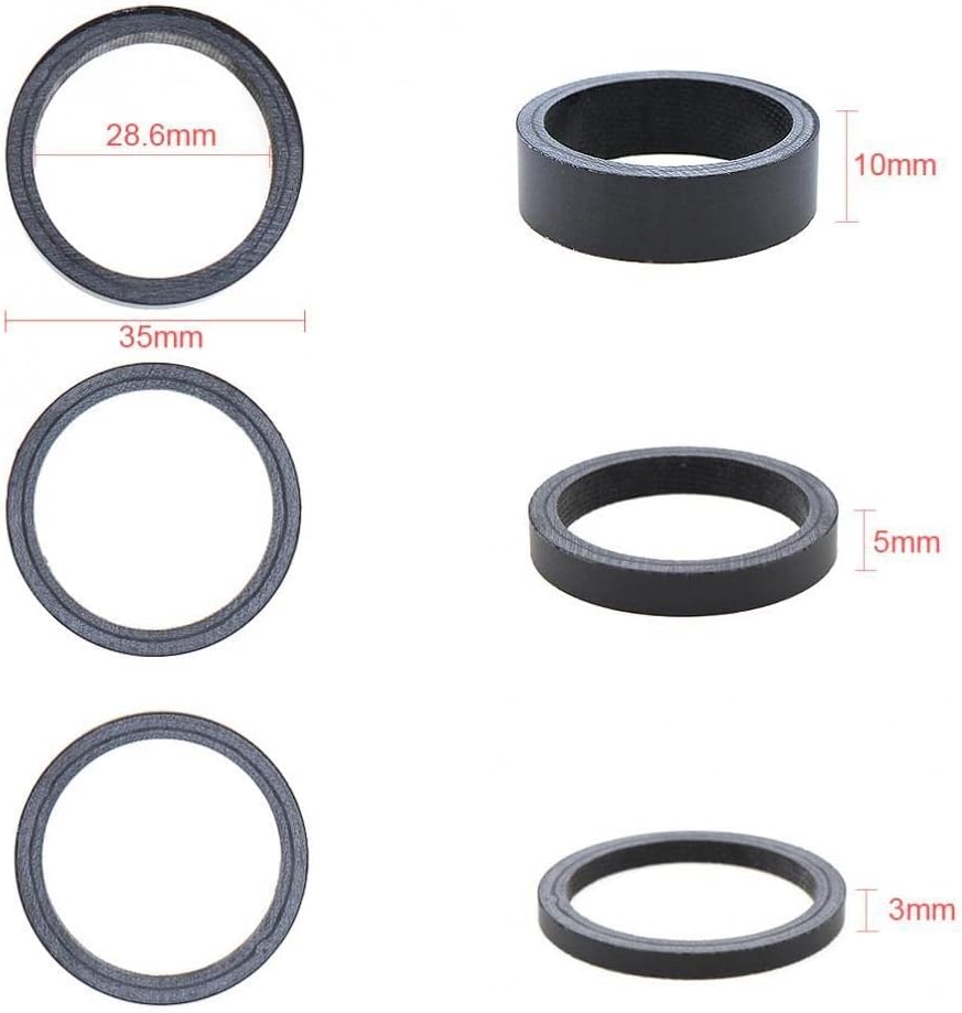 Features:- Use for 1 1/8"(28.6mm) stem.- These are carbon fiber headset spacers in carbon fiber.- These are for oversize forks and stems at 1 1/8". It is 3-5-10mm high. It is to get a good fit on your bike.- If you need to raise your handle bar, use these spacers.Material: Full Carbon FiberDiameter: 28.6mm ( 1 1/8" )Package include2 x 3mm Thick Spacers2 x 5mm Thick Spacers2 x 10mm Thick Spacers