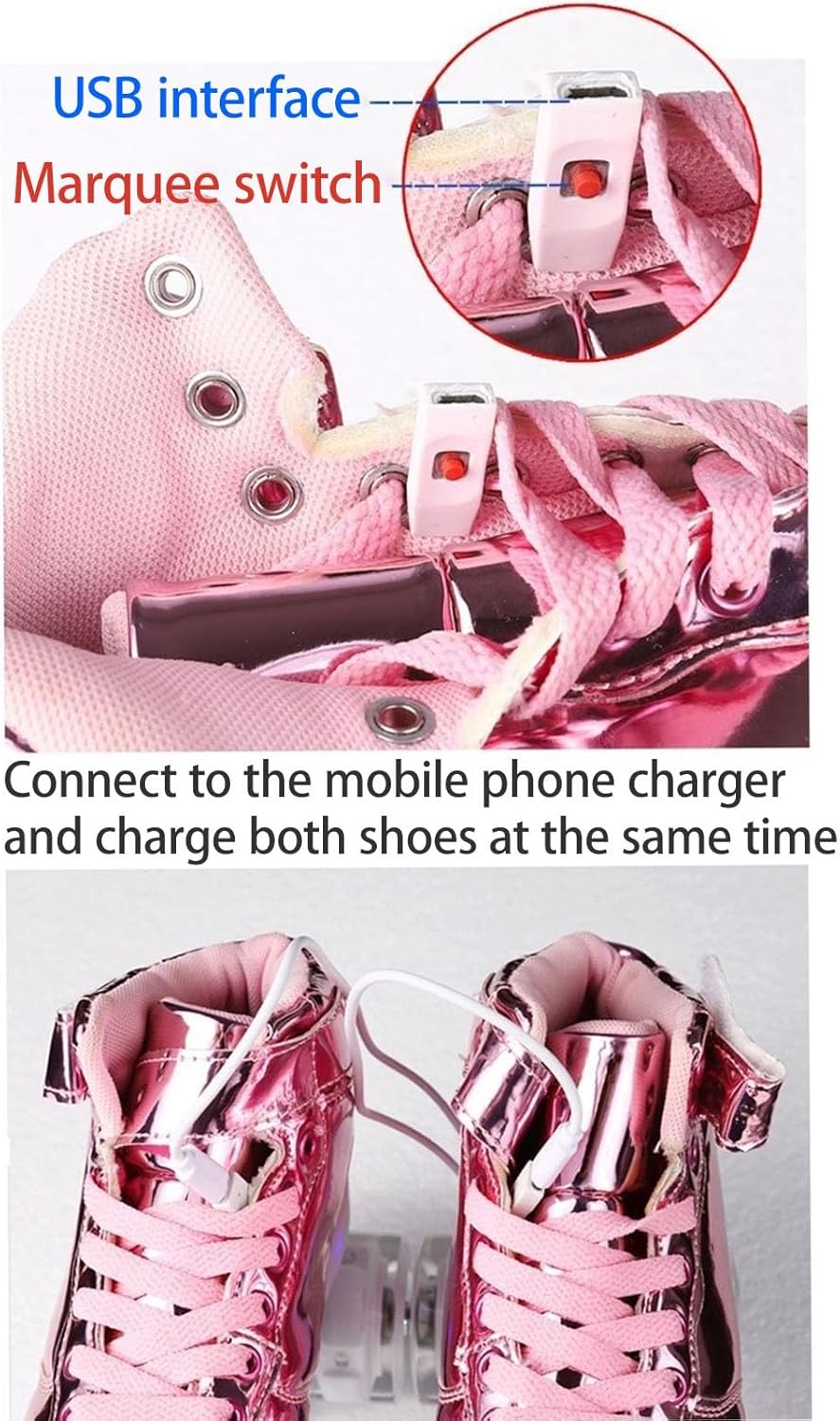 1. High-Quality Material: Roller skates are crafted from premium materials that ensure durability, flexibility, and comfort. The upper is made from high-quality PU leather, which is both waterproof and resistant to wear.2. Rechargeable: Charging port is around the magic tape or inside the shoes, with USB cable to charge. Usually charge 2-4 hour, the led can work 6-8 hours.3. Double Row Roller Blades: These roller skates feature a double row of high-quality chrome wheels, offering enhanced stability and control, making them perfect for both beginners and intermediate skaters.4. Comfortable Fit: These roller skates are designed to fit the contours of your feet, ensuring a comfortable and secure fit. The high-quality laces and Velcro straps provide a personalized and secure fit, keeping your feet secure and comfortable during long skating sessions.5. Ideal for Outdoor Skating: These roller skates are perfect for outdoor skating, such as at parks, on sidewalks, or along bike paths. Their durable construction and reliable performance make them an excellent choice for enjoying the great outdoors on wheels.6. Versatile and Stylish: These roller skates are not just for skating; they can also be used for casual wear, as they are stylish and fashionable. Their versatile design makes them a perfect addition to any wardrobe, allowing you to make a statement with your unique style.7. Flashing Gift: The gift for kids for birthday, performances, Halloween, Thanksgiving and Christmas Day and other celebrations. Enjoy entertainment and skill growth.