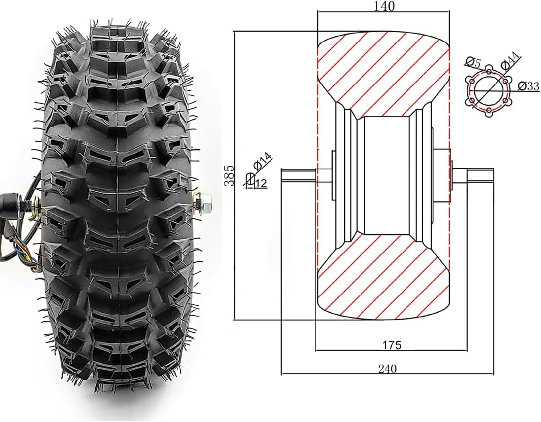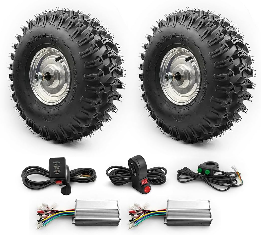 500W Atv Snow Sweeper Agricultural Vehicle 15X5.00-6 Tubeless Vacuum Tire Brushless Gear Hub Motor wheelDescriptionReport ItemVoltage:24V,36V,48VSpeed:9km/h,11km/h,14km/hMax Power:500wTorque:100NmGear ratio: 5:1Fork size: 170 mmLength axle: 240 mmOne motor loading weight: 200kgsBrake: Disc brakeWith hall sensorsThere are two types of this motor : " dual axle " and " single axle ",this listing is " dual axle ".Note:the remote controller will always brake the motor wheel when the system is on, this is better when you push the cart down hill, so that speed can be slow.But you can accelerate the motor with the throttle as normal, and if you want to push the cart without the motor power, you can just turn off the system to cancel the brake.1). This item is a geared motor wheel that speed is slow, it is not good for the high speed project.If you do not know what motor you need to use, please feel free to ask me.2). This kit's total power is 1000W (the motor is a 500W brushed motor each), and it can drive max 400kg.3). For the max speed, 24V max speed is about 10km/h, 36V is about 12km/h, and 48V is about 16km/h.4). The "ESC small" is a single-hand remote that has a small li-ba inside, the "ESC big" is a two-hands remote .the remote can control the motors to run forward, backward, turn left, right, brake and cruise.5). The " Thumb throttle kit " is a wired speed control system.it can control the motors to run forward, backward, E-brake and cruise.it can't park the car on a slope.The remote kit includes:1). 2 x 15 inch 500W brushless geared hub motor (with tire)2). 2 x Motor controller3). 1 x ESC small remote or ESC big remoteThumb throttle kit1). 2 x 15 inch 500W brushless geared hub motor (with tire)2). 2 x Motor controller3). 1x Thumb throttle (with battery indicator lights & button switch)4). 1x Dual button switch (electric brake and cruise)5). 1x Red button switch (reverse and 3 speed)