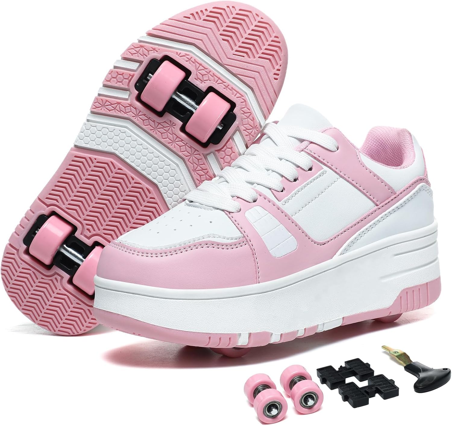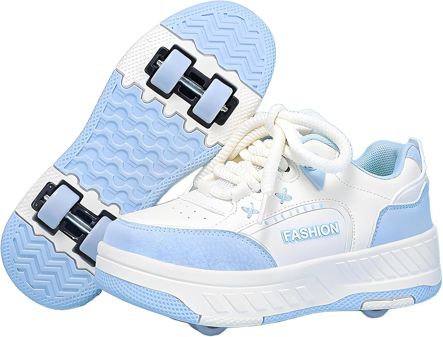 **Product Overview**--Product Type: Detachable Wheels Roller Skating Shoes for Beginners--Season: All-season (suitable for year-round use)--Sole Material: TPR (Thermoplastic Rubber) durable and flexible--Insole Material: Cloth and PU soft and comfortable for extended use.--Upper Material: PU and Fabric lightweight, breathable, and stylish.--Inner Material: Fabric ensures comfort and breathability.--Closure Type: Lace-up provides a secure and adjustable fit.--Toe Cap: Round Toe offers ample space and comfort for toes.--Scene: Casual, Hiking & Outdoor, Daily & Casual --Style: Sports, Casual, Street trendy and functional.--Popular Elements: Splicing design adds a modern and fashionable touch.--Applicable People: Boys, Girls, Youngsters designed for a wide age range.--Operation Instruction: Avoid exposure to the sun **Note**For safety reasons, children must be accompanied by an adult while using these roller skate sneakers. Adult supervision ensures that kids can enjoy the fun of skating .