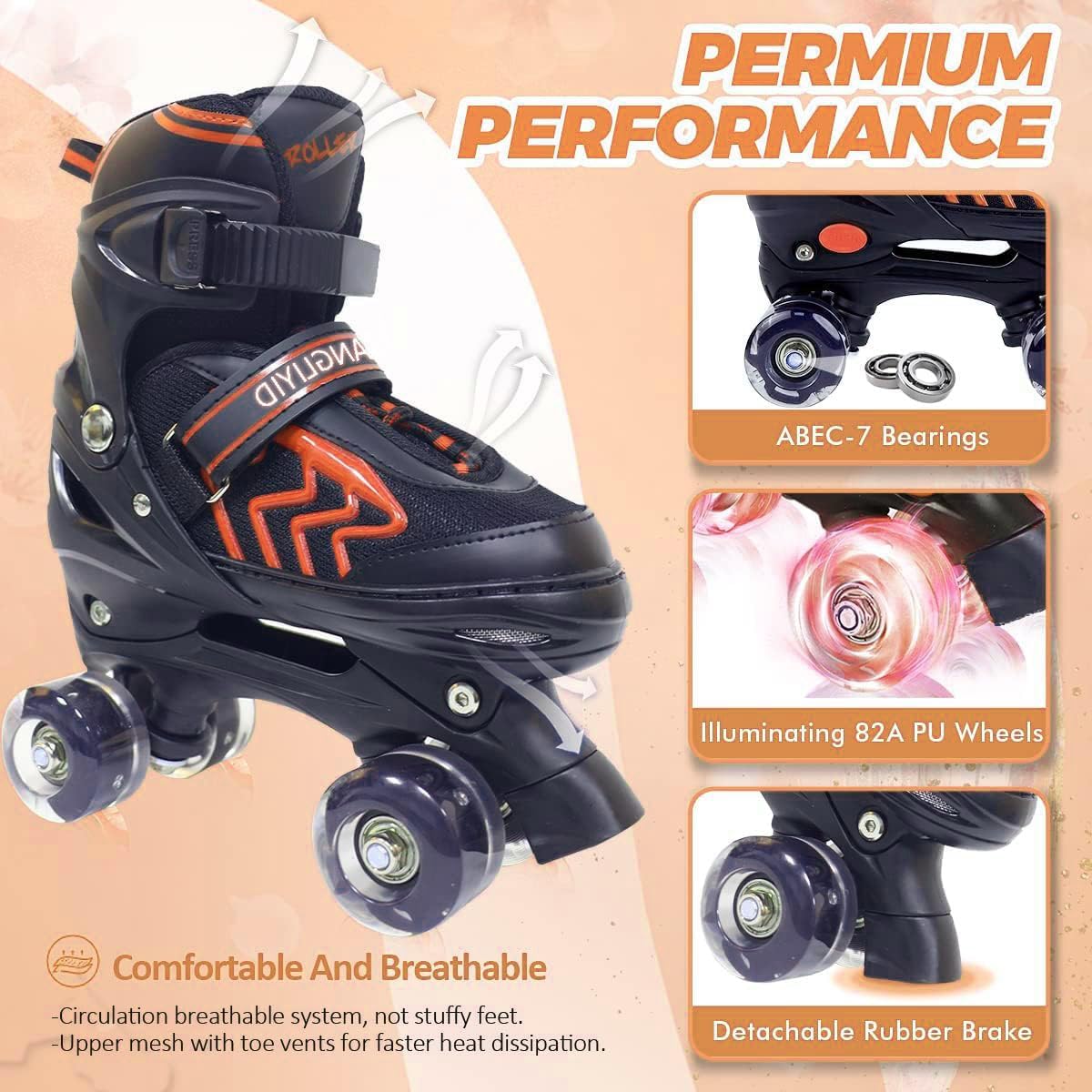 Kids Roller Skate Safety Tips : 1. Ensure your child has appropriate safety wear: Put him on a kids helmet protective set, help protect his ankle, knee pads and wrist guards. 2. Wear one pair of athletic socks. Skates should fit securely without being too tight or uncomfortable. 3. Younger children should slide under adult supervision. Before skating, please do some warm-up exercise. 4. Before getting started, wiggle each wheel to check axle tightness. If bolts/screws that secure the wheels are loose, tighten them with the Allen wrench included in the box. 5. Look for safe spots: Avoid skating on wet, oily or uneven surfaces and avoid skating on a packed road. 6. Watch for repairs: Inspect your kids safety equipment every time before used and replace any that has been damaged. To ensure a smooth ride, please lubricate the bearings every 4 weeks. 7. Attention:For the packaging bag, Bags can be dangerous. To avoid danger of suffocation, keep this bag away from babies and children.