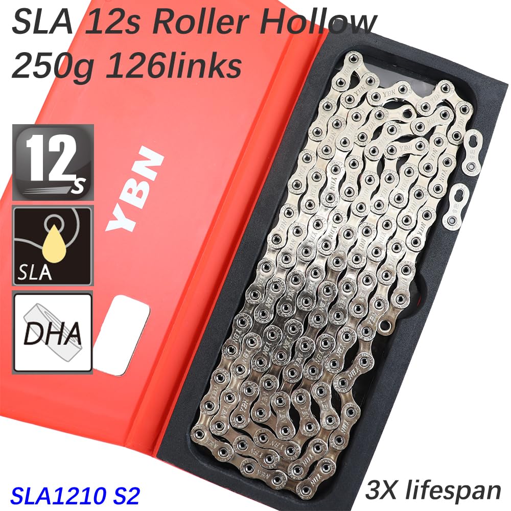 DJC Bike Chain 12 speed for road bike MTB mountain Roller Pin Hollow with quick link YBN SLA for Shimano Sram system and KMC 1/2"x11/128" SLA1210FeaturesModel: 12 speed support, 1/2"x11/128", 126 links. Weight 250g/8.8oz. Positioning to advanced professional racing level riders. Roller pin hollow design with SLA tech. Upto 6000km lifespan, 2-3 times life longer than entry level chains. Value for your money.Compatibility: works with Shimano and Sram system. Compatible to KMC chain as well. Trouble free when choose a new chain for your MTB and road bike.SLA + Titanium Tech: Superior Lubricating Aid and Titanium coating. The SLA level chains is advanced level for racing riders. More lightweight, smooth, quiet, super lifespan.Technology: Build by YBN DHA coating treatment technology and Teflon coating, coating with special chromium carbide layer. Makes the chain long lifespan and reduce noisy.Teflon coating applied offers excellent non-stick/waterproof properties so is very easy to clean.Package Content: 1 set chain and 1 pair quick link. Easy Install: symmetrical design you can install from any direction.About ManufacturerYBN is the first create the lightest and most technically advanced Titanium Chain in the world. Utilized Titanium materials with superior technology, precision chamfering and Ni-PTFE coating to manufacture super light, slim, robust, and low friction bike chains.Provide sportive riders maximum precise,smooth, fast shifting and riding Performance, suitable for everyday use as well as racing. Perfectly compatible with Shimano,SRAM, all worlds’ leading bicycle drivetrain and derailleur systems.The best chain you desire.