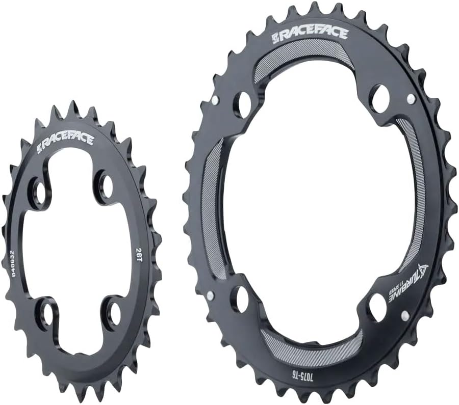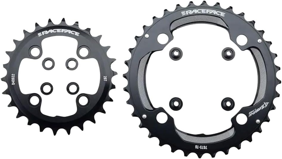 Upgrade your cycling performance with the RaceFace Turbine Chainring 26/36T, designed for serious road and mountain biking enthusiasts. Crafted from CNC-machined 7075 aluminum, this high-performance chainring offers exceptional durability, strength, and lightweight efficiency-all vital for aggressive riding and demanding terrains. Materials & Construction: Made from CNC 7075 aluminum, the RaceFace Turbine chainring combines corrosion resistance with superior mechanical strength. Its asymmetrical tooth profiling features optimized up-shift and down-shift zones, ensuring precise, smooth, and quiet shifting under load-ideal for high-intensity rides and technical trails. Performance & Engineering: Engineered with three times the stiffness of traditional RaceFace team chainrings, the Turbine series guarantees enhanced power transfer and reduced flex for maximum efficiency. The asymmetrical design improves shifting responsiveness and drivetrain stability, making it a top choice for both road cycling and mountain biking applications. Components & Technology: Designed to fit 11-speed drivetrains, this set includes both inner (26T) and outer (36T) chainrings with 64/104 BCD bolt circle diameter, compatible with Race Face and cranks. The round teeth profile optimizes gear engagement, while the precision-machined finish ensures long-lasting performance and easy installation. Style & Use Case: Sporting a sleek black anodized finish, the RaceFace Turbine chainring not only looks sharp but is built for versatility-from aggressive mountain trail riding to high-speed road adventures. Whether upgrading your existing drivetrain or building a custom setup, this chainring delivers reliable, crisp shifting and increased drivetrain stiffness for confident performance in all conditions. Innovative & Differentiating Features: - Asymmetrical tooth profiling for seamless shifting under load - CNC-machined from lightweight 7075 aluminum for durability and reduced weight - 3x sti