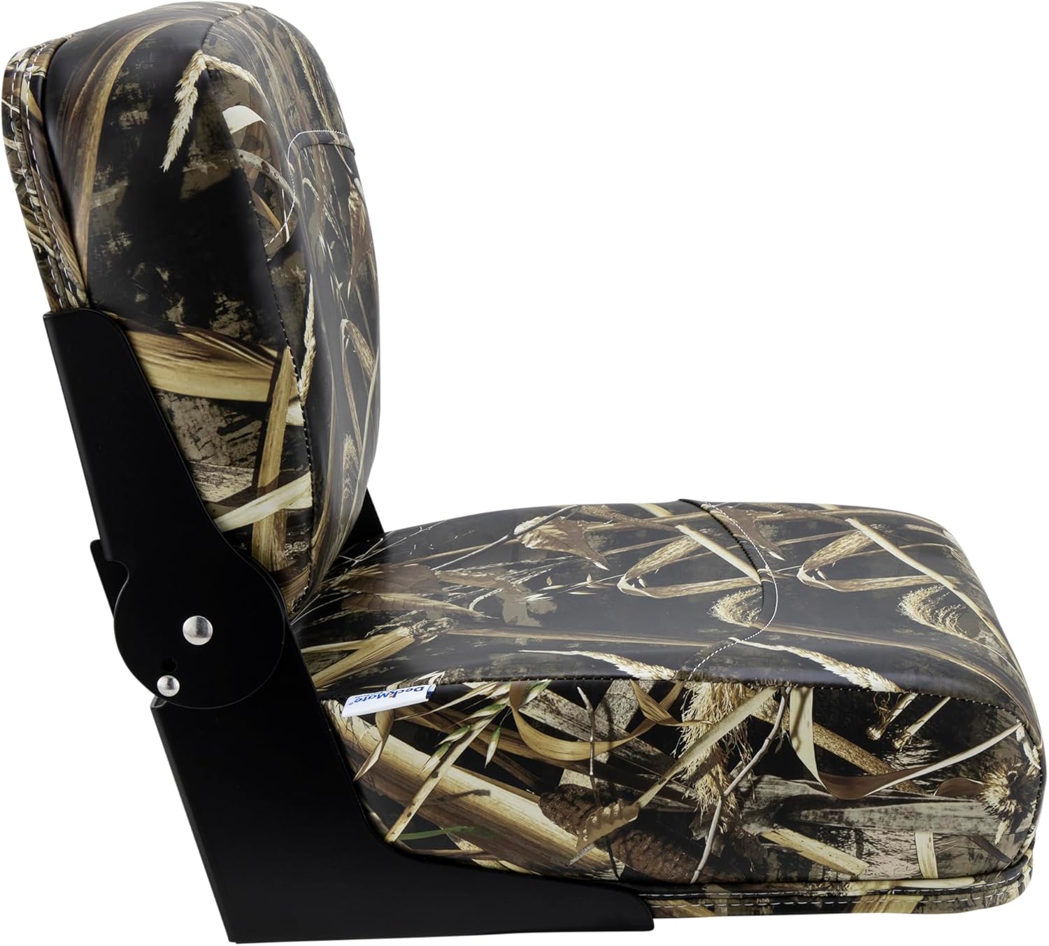 Camouflage 12" Bench Mounted Buddy Boat Seat 12" wide fold down seat with plastic frame Camo Boat seat folds flat and can be strapped shut Bench mounted seat is designed with step back Factory Grade Replacement Seats 6 year full replacement warranty on upholstery 32oz soft to the touch, marine grade seat vinyl Pinchless hinges are powder coated aluminum SEAT DIMENSIONS 12" wide, 16.5" tall, 15.5" depth Heavy duty hold down straps will not stretch or fail Plastic frames with 100% stainless steel hardware All mounting hardware is included (stainless)