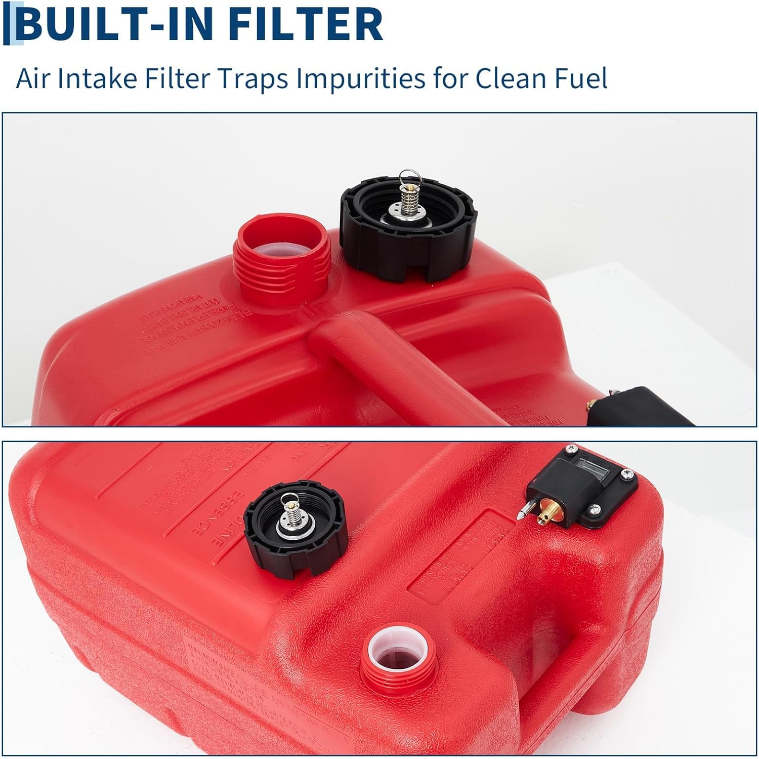 6 Gallon Marine Tank, Marine Boat Tank with I-Shaped Handle, 24L Outboard Marine Boat Tank with Transfer Hose & Gauge for Outboard Engine, Yacht, Fishing BoatLevel Indicator and Integrated Filter: Marine tank is equipped with a clear fuel level indicator to track fuel levels in real time, ensuring timely refills. Its built-in air inlet filter delivers clean fuel, safeguarding optimal engine performance.Strong Compatibility: Marine tank comes with hose (0.3"/8 mm inner diameter) compatible with most marine tank interfaces. It’s the perfect match for fishing boats, deck boats, and various marine adventures.Fuel Pipe and Pump: Marine tank includes a fuel pipe and manual squeeze pump—simply squeeze the pump to fill the tank effortlessly, offering hassle-free operation and unparalleled convenience for marine use.Dual Sealing and Venting Modes: The fuel tank cap features a golden nut that allows you to adjust between sealing and venting modes for safe operation. A high-quality spring mechanism facilitates deflation by loosening the yellow metal nut, while tightening it ensures a secure seal to minimize fuel leakageFuel Pipe and Pump: Effortlessly fill your tank by squeezing the fuel pump, and enjoy hassle-free usage with the included fuel pipe, providing you with unparalleled convenience