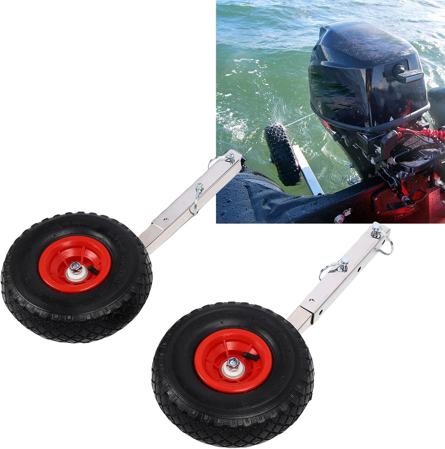 Spec: Item Type: Inflatable Boat Launching Wheels Material: Stainless steel + rubber Fitment: The inflatable boat transom launching wheel is widely applicable to most boats with a transom, such as dinghy, inflatable boats, rowboats, sailing dinghies, etc. PackageList: 2 x Wheels 2 x Brackets 18 x Installation Screw Accessories
