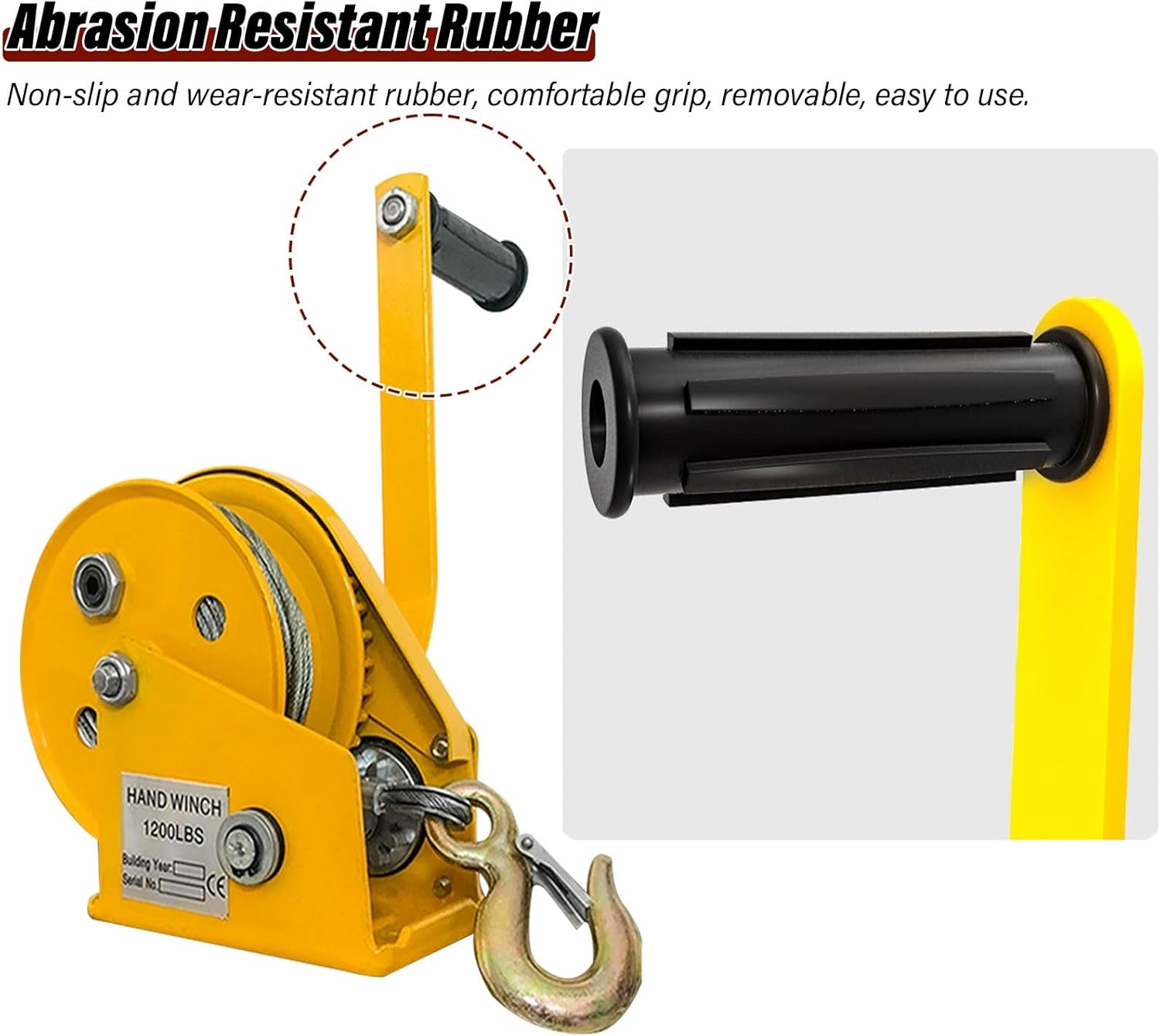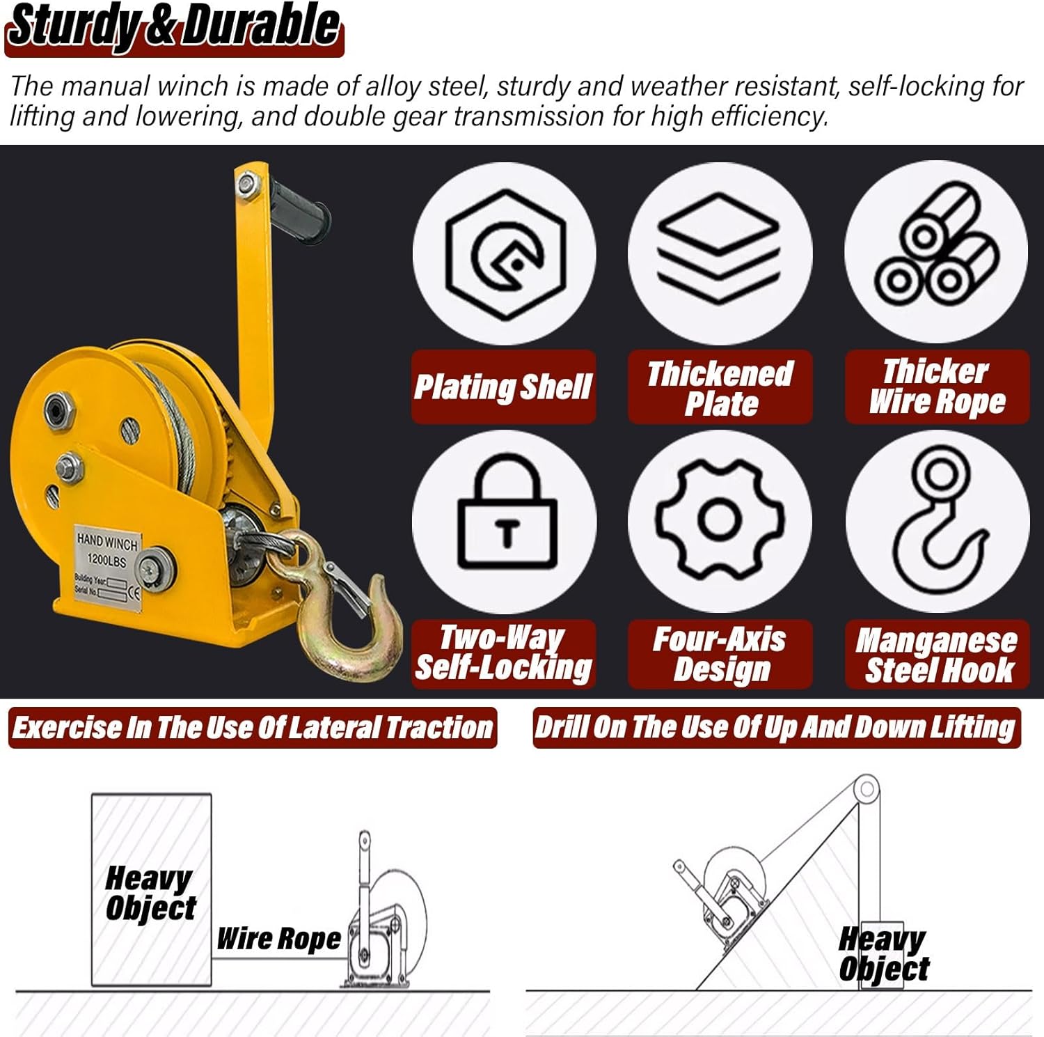 ? What is this? --- Our hand winch is suitable for family, production workshop, warehouse storage, machinery manufacturing, trailer and larger heavy items are not convenient to move, efficient and labor-saving, suitable for use in many fields, looking forward to serving you! ? What are the specifications for this product? → Product Name: Crank Hand Winch With Steel Cable → Product Material: Alloy Steel → Product Color: Yellow → Lateral Traction: 1200-2600LBS/(544.3-1179KG) → Longitudinal Tension: 330.7-1102LBS/(150-500KG) → Gear Ratio: 4:1 , 8:1 → Manual Effort: 180N,190N ? Are there any features of the product? → Built-in brake, safer and more convenient to use. → Resistant to bad weather, easy to install, keep safe. → The smoothly ratchet handle can easily pull out the power. → Two-way pawl, self-locking is more reliable and lifting is safer. → Compact size, portable and light in weight, easy to carry and use. → Professional manufacturing, high reliability, suitable for boat trailer. → In the case of power failure, it can play a self-locking function. → Heavy-duty alloy steel construction for wear resistance and longer service life. → Can be used to lift heavy objects, drag boats, or volleyball net, Ideal for trailering. → Hand crank cable gear winch it has two-way self-locking device, self-locking nut double safety. ? What will you get? → 1 × Hand Winch → 1 × Hook → 1 × Handle → 1 × Strap → 1 × Glove ? What should you notice? → 1. Do not load a winch that exceeds its rated capacity. → 2. Manual measurement, it is inevitable to have errors, please refer to the actual received products prevail.