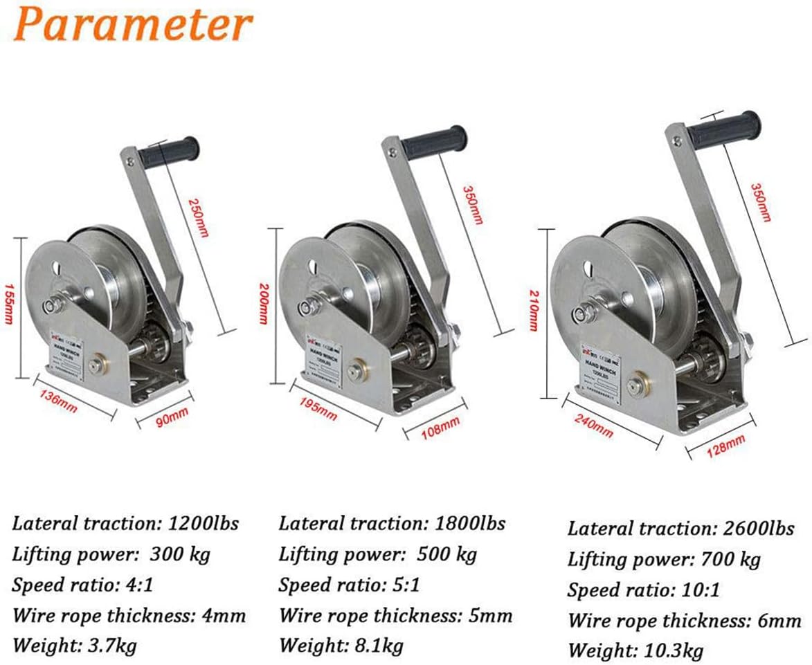 Specification: Type: Manual winch Material: steel Pull weight: 1200lbs/1800lbs/2600lbs Transmission ratio: 4:1/4:1/8:1 Wire rope thickness: 4mm/5mm/6mm Machine weight: 8kg/1kg/3kg ******* Feature: Double-layer aluminum mechanical pressure sleeve to protect the wire rope from breaking. Made of steel surfac for maximum strength and service life, resistant to rust and corrosion. The manual winch adopts labor-saving bearings, which is more labor-saving and has a lower friction coefficient. Anti-slip handle ensures a tight grip, thereby reducing user fatigue and increasing productivity when turning the manual winch. The wire rope and the hook are connected by a triangular connection ring without decoupling. ******* Package Contents: 1 x manual winch