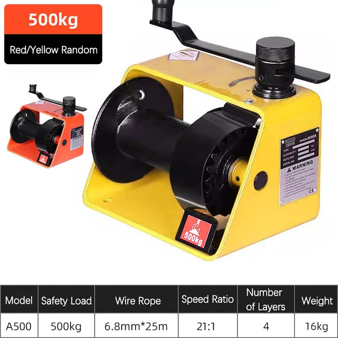 Product Specifications: Test Load: 500 kg Color: Yellow Applicable Wire Rope: φ6.8 mm (not included) Speed Ratio: 21:1 Handle Length: 240 mm Package Included: 1 x Heavy-Duty Manual Winch Note: The cordless model does not come with a wire rope or hook