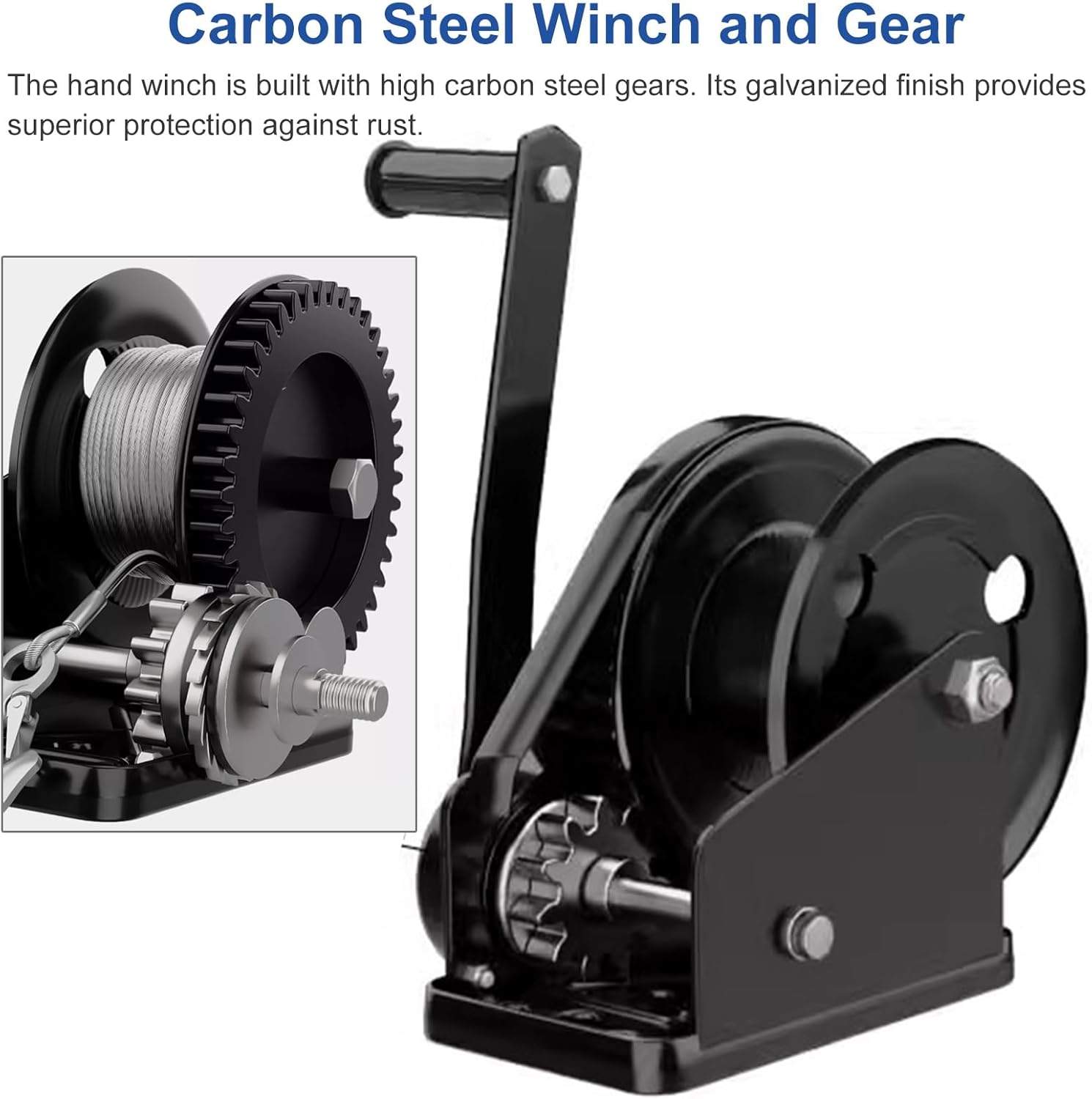 Ours towing winches are designed for pickup trucks, trailers, and towing boats, loading boats, trucks, ATV, UTV, Jet Ski, etc. Their sturdy construction ensures durability and reliability, even in tough weather conditions.●SpecificationMaterial: Carbon SteelGear Ratio: 4:1Horizontal Tractio Load: 800kg/1700lbsVertical Tractio Load: 200kg/400lbsManual Handle Force: 180 NWire Diameter: 4mm/0.16 inHook Tractio Load: 500kg/1100lbsWinch Bare Weight: 4kg/8.8lbs●Our AdvantagesTwo-way ratchet, allows for both forward and reverse cranking from one side.Winches with mooring hooks and safety jaws offer bi-directional ratcheting capability.Non-slip rubber grip with ergonomic design, easy to use for easier and more comfortable operation.●Warm Tips1. Perform routine inspection of the tool before use, do not use damaged tools, and regularly apply lubricant to the operating parts. Keep other people away from the operating area during operation.2. Do not use the wire rope if it is found to be worn/broken and do not exceed the working load. Do not use handle expanders to increase leverage.3. Loads should be in a straight line and hook to hook, keep hands and clothing away from all running parts do not wrap the rope around an object or hook yourself.4. Use the original setup and do not modify it. Make sure that the safety clasp of the hook is tightly fixed.5. Do not place the protruding part of the hook on the tip of the gear.
