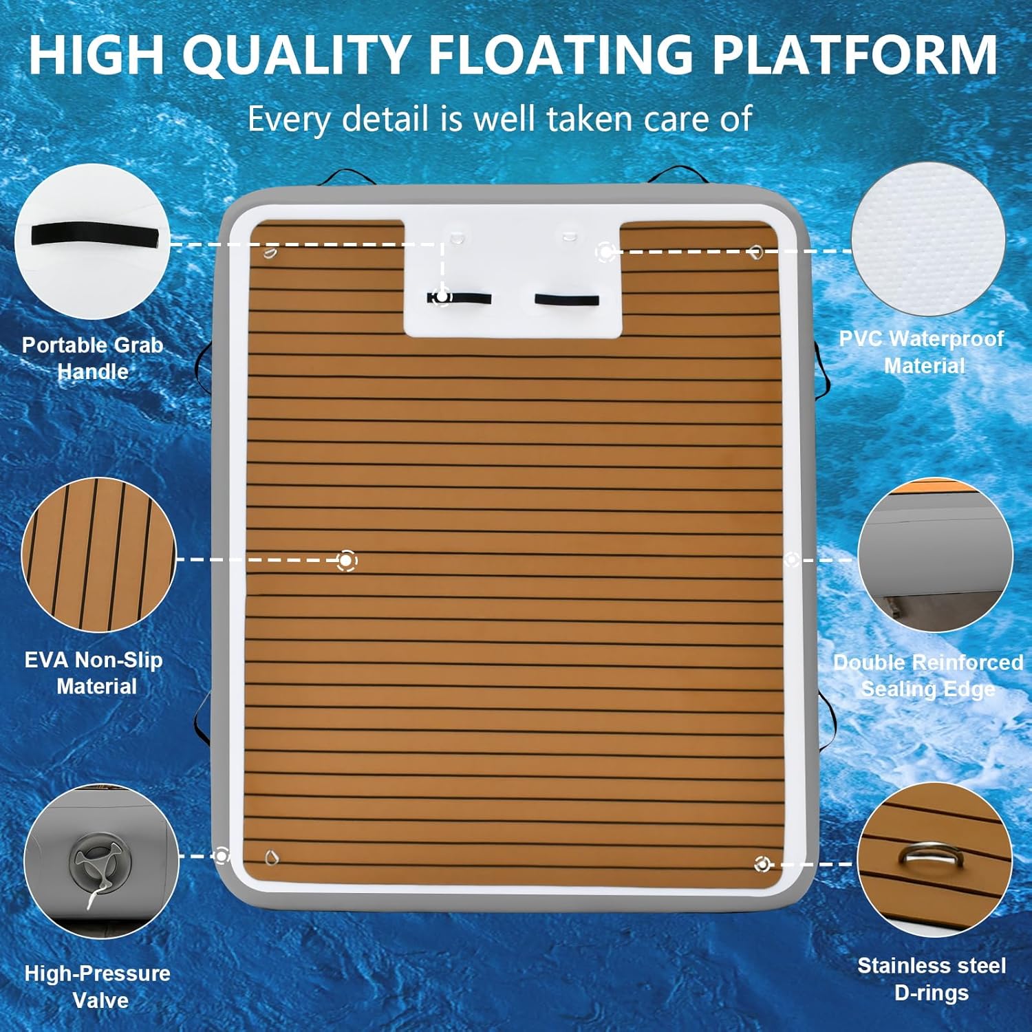 ·Package Contents: 1 x Wood Grain Inflatable Floating Dock 1 x Manual Air Pump 1 x Floating Dock Tether Rope 1 x Ladder 1 x User Manual Setup Instructions: 1.Unpack and Inspect: -Remove the inflatable floating dock from the packaging and lay it flat on a clean, flat surface. -Inspect the dock for any damages or defects. If any are found, please contact our customer service team immediately. 2.Inflate: -Attach the nozzle of the manual air pump to the inflation valve of the dock. -Inflate the dock using the manual air pump until it is fully inflated and firm. Be careful not to overinflate, as this could damage the dock. 3.Usage: -Once inflated, place the floating dock in the water, ensuring it is stable and floats evenly. -The dock can support 3-8 people, depending on the size. Ensure the number of people and weight are within the dock's capacity. 4.Deflate and Store: -After use, remove the dock from the water and deflate it by opening the inflation valve. -Once fully deflated, fold the dock neatly and store it in a dry, cool place, away from direct sunlight and sharp objects.