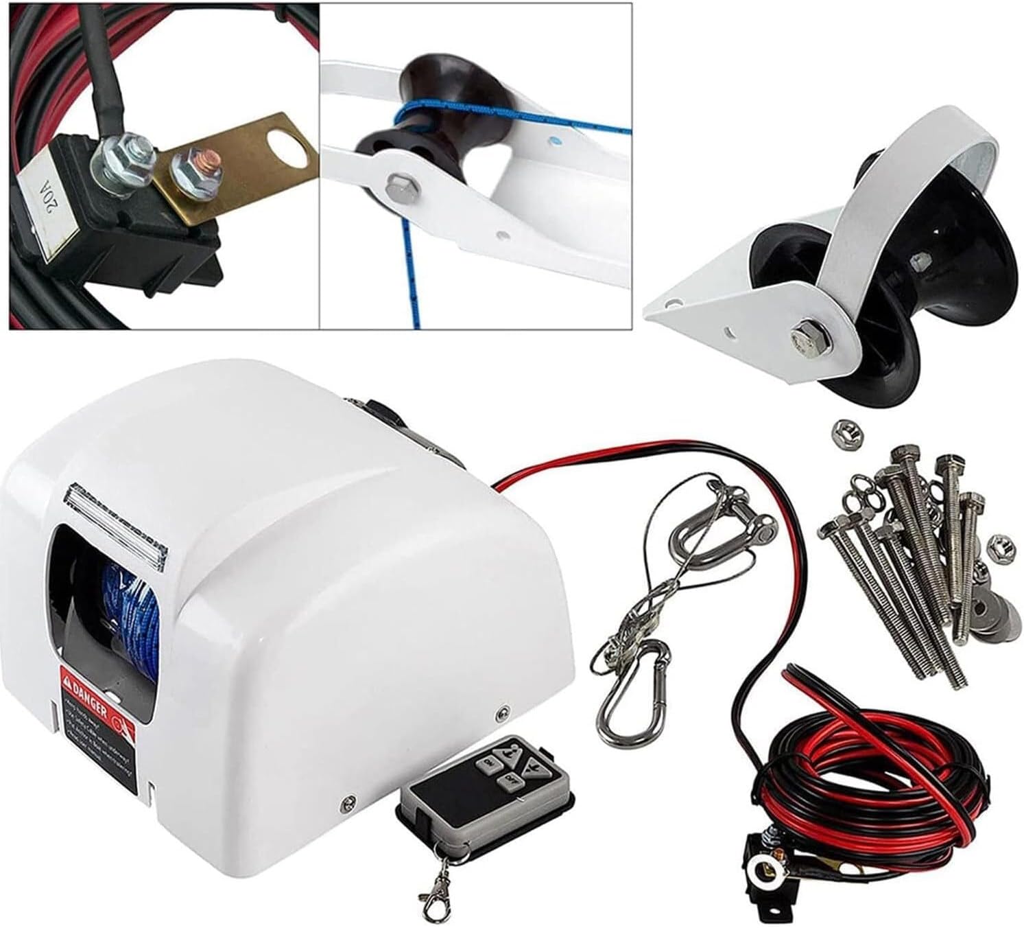 This electric anchor winch can be used in salt water. It includes extra corrosion protection, added UV inhibitors, and stainless steel hardware. You can also use it in fresh waterAnchor winch Just press a button (up and down), the anchor can be powered up and down smoothly and quietly, while you can continue your sailing activities?Features:1. Electric up and automatic down function2. Press the button to release the anchor and let the anchor fall quickly. The cable will not rebound3. Electric windlass and integrated anchor rollerThe anchor roller installation position can be close to the windlass or a distance away from the windlass, and the installation position is determined by the length of the anchor handle.4. up/down switch5. The cable recovery speed is 21.3 meters/minute when it is unloaded6. Circuit breaker: No need to replace fuses7. Safety rope: Secure the anchor when it is not in use?Specifications:Product name: Electric anchor winchColor: WhiteVoltage: 12VRecovery speed: 70 feet/minute (no load)?Packing list:1 * Anchor winch1 * Remote control switch (Battery number: LR27A 12V L828, battery not included)1 * No. 10 marine grade wire (tinned)1 * Assembly materials and instructions