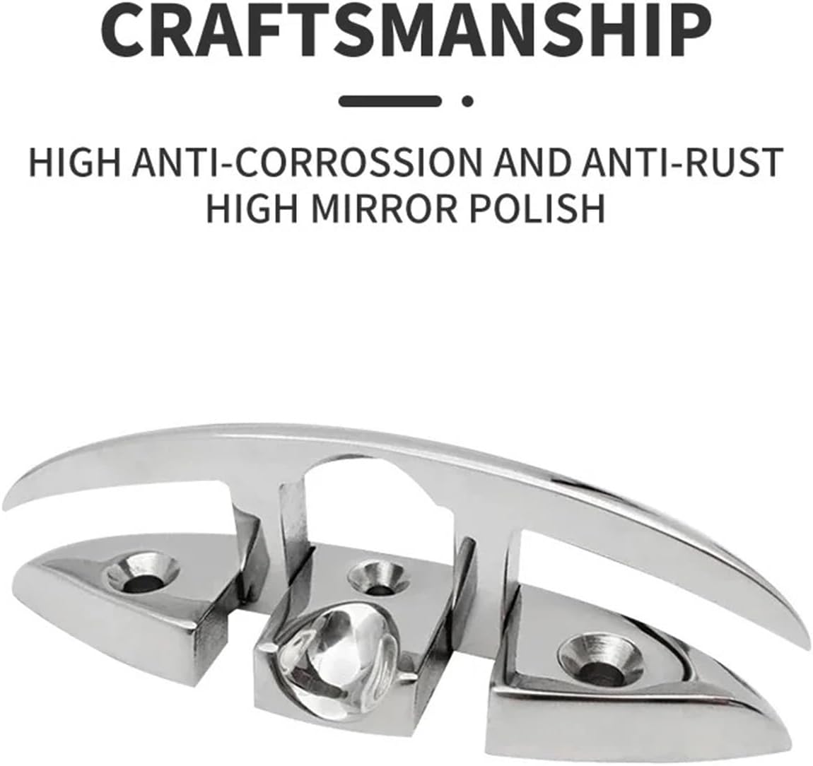 Stainless SteelBoat Folding Cleat.Made of heavy duty 316 grade stainless steel, sturdy and , long time to use.Adopt fine grinding mirror polishing, precise, bright and with good flatness.Great rope cleat for dock lines, anchoring, mooring.Great choice for sailing, motor boating and other water-sports applications.==========Size : 6 inchType : cleatsMaterial : 316 Stainless SteelOrigin : Mainland Color : Silver