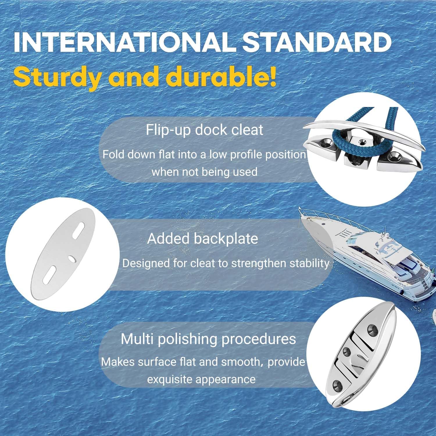Folding cleats for docks are made of grade 316 stainless steel, also as known marine grade stainless because of the very high chromium content to resist rust. Dock cleat use machine screws that go all the way through the deck and are fastened with nuts and washers on the bottom side. It is the satisfactory way to mount something that is so critical to retaining your boat at the dock. The center mounting screw really adds dock cleats steadfastness. Ideal for decks where you don’t want to risk snagging things with a standard style cleat, because these boat cleats fold and present a smooth and low profile. Boat dock cleats flip up are ideal for decks where you don’t want to risk snagging things with a standard style cleat. Note: Light reflection and different displays may cause the color of the item in the picture a little different from the real thing. The measurement allowed error is +/- 1cm.