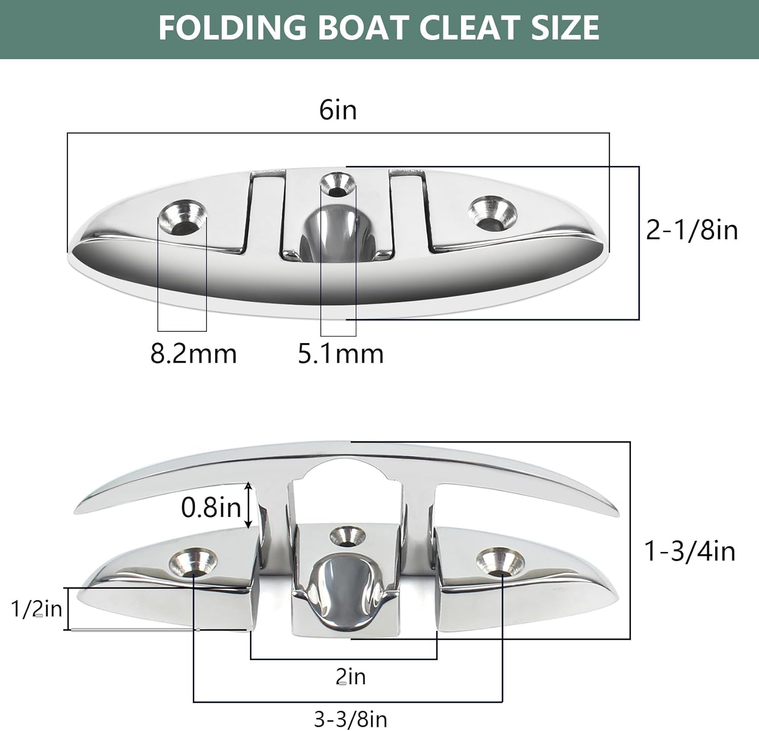 Product InformationProduct Name:Boat Cleat,Boat Dock CleatMaterial:316 Stainless SteelProduct Size:5in/6inProduct Features:Folding Design,Filp up,Strong & SturdyPackages Includes:Boat CleatBolts&NutsScrewsWashers