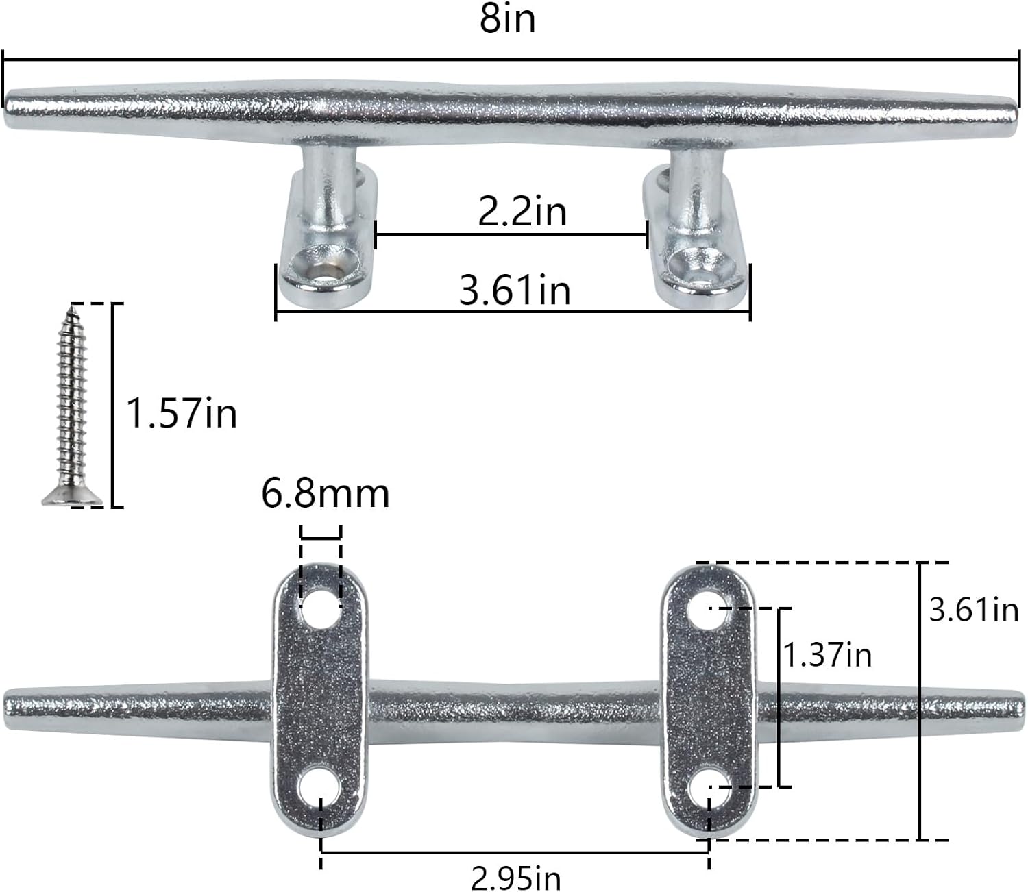 • Boat Dock Cleats 8 inch: Packing include 4pcs boat cleats 8 inch, 16 pcs screws. This boat cleat 6 inch is made of high quality chromium- plated steel materials, corrosion resistant in freshwater or saltwater circumstance, not easy to rust and good welding performance. Their exceptional performance is matched only by their robust construction. The dock cleat 6 inch can ensure your vessel is tied securely to the dock.