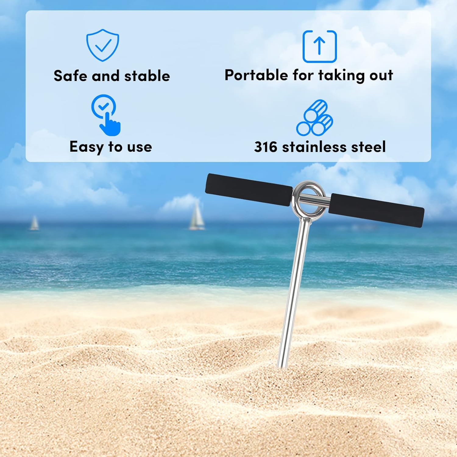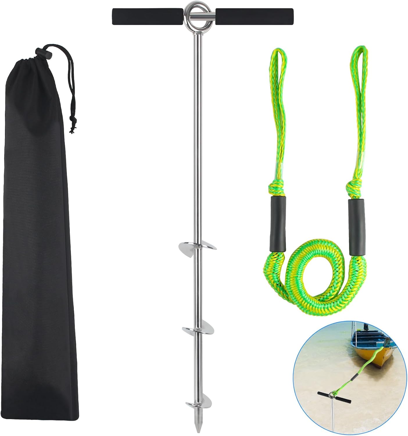 Product DescriptionProduct Category: Sand Anchor,Beach Anchor,Pontoon Anchors,Boat Sand Anchor,Sandbar AnchorProduct Materials: Chromium-Plated Steel/316 Stainless SteelProduct Color: SilverProduct Size: 18"L/24"L/36"LHandle: Removable Foam HandlePackage Includes:Sand Anchor for Boat 18in/24in/36in4-5.5ft Bungee Dock LineStorage Bag