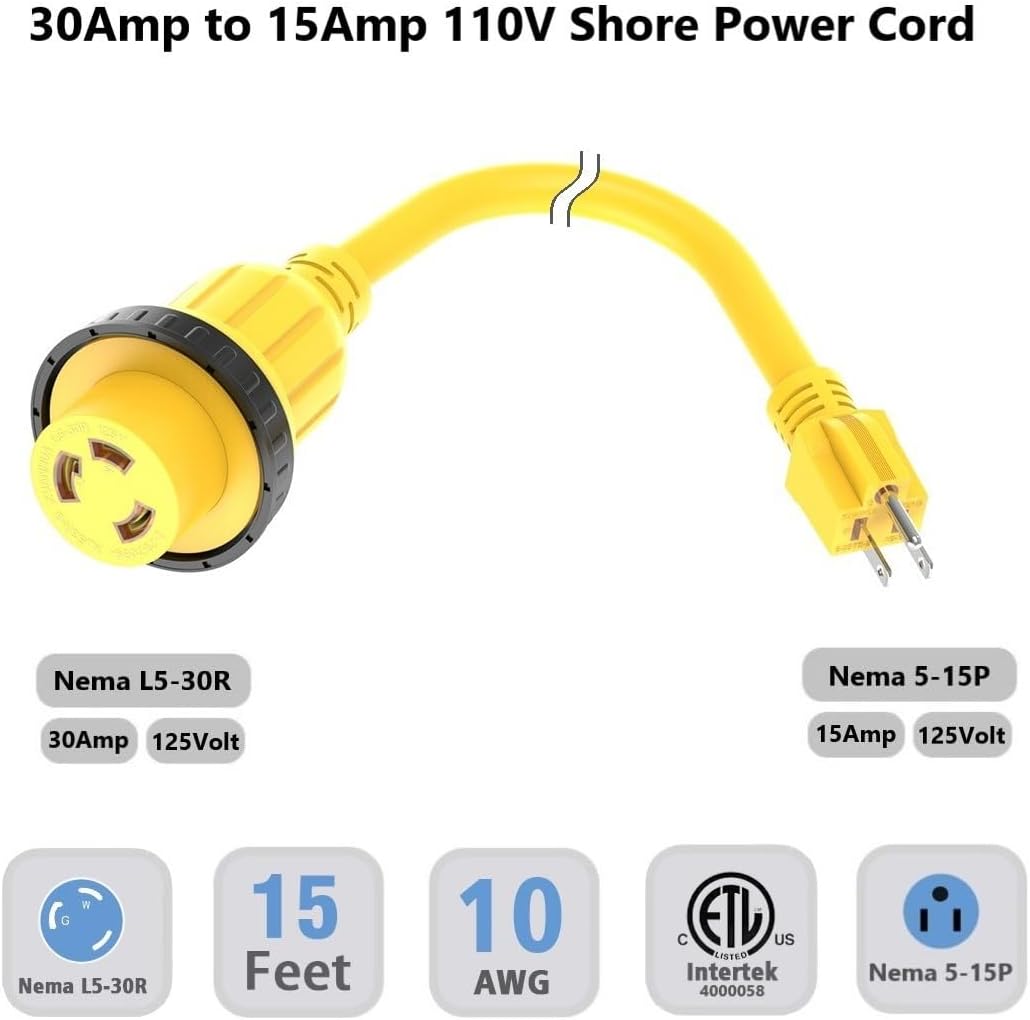 Marine 30a to 15a shore power cord extension L5-30R to 5-15P 15FtNema L5-30R, 30 Amp, 125 volt locking plug, shore power twist lock 30 amp female receptacle with locking ringNema 5-15P, 125 volt 15amp household ac plug30Amp nema L5-30P twist lock male to 15amp 5-15P male shore power exntione cable 15 Ft,Rated @15A 125V/1875WETL CertificatedAC power cord: STW 10awg/3 conductors, true copper wires inside