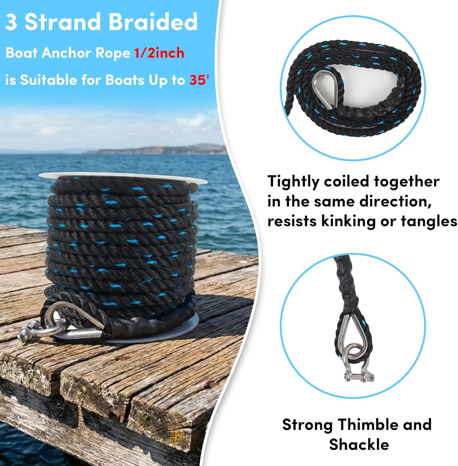 Product Parameters Product Name : Marine Grade Anchor Rope 3 Strand Product Material : Polyester (Super Strength and Flexibility) Product Breaking Load : 4544 LBS and 10150 LBS Product Maximum Working Load : 865 LBS and 1300 LBS Product Color : Black/White/Black & Lake Blue/Lake Blue Product Diameter : 1/2 Inch & 3/4 Inch Product Length : 50FT & 100FT & 150FT Shackle Size : Thimble Inner Diameter Size : Accessories Material : Stainless Steel Product Scope of Application : The 3 strand boat anchor line can be used anywhere you need, including but not limited to towing, docking, boats, mooring, etc. Note : this anchor rope 1/2 inch has a load limit of 4544 LBS, it is suitable for boats up to 35', and anchor rope 3/4 inch has a load limit of 10150 LBS, it is suitable for boats up to 48', please choose carefully. Package Includes: 1 X Marine Rope With Thimble 1 X Stainless Steel Shackle