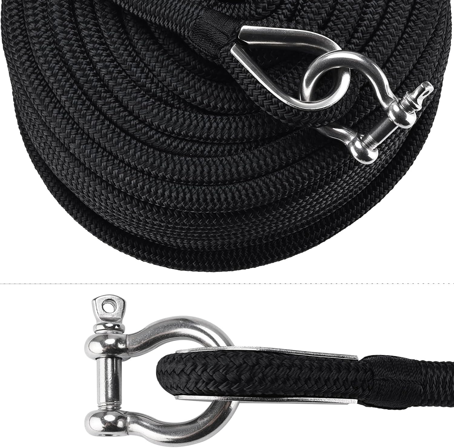 Rope material:nylon Anchor rope dia.: 5/8 Inch Anchor rope length: 150 Feet Boat rope working load limit:1,600 Lbs Boat rope breaking strength:8,400 Lbs Rope optional color:black,white&gold,black&white Anchor line construction:braid on braid (double braid) Boat nylon rope great strength and shock load resistance and handles easily Marine rope with stainless steel thimble and heat sealed bitter end Each double braid rope includes a spliced stainless steel eye thimble and shackle for easy attachment to your anchor,swivel,chain and so on Package 1 x (5/8" * 150') Double Braid Nylon Boat Anchor Rope with Stainless Steel Thimble and Shackle