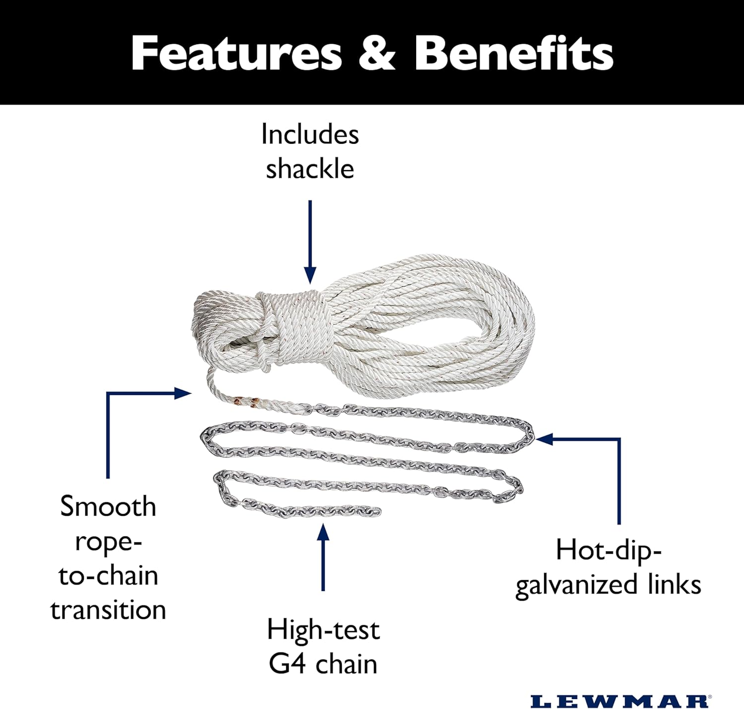 Your anchor rode is an important part of your anchoring system, and you rely on it to connect your anchor to your boat. Our anchor rodes are designed for exceptional performance. The strong nylon rope with hot-dip-galvanized G4 chain makes the rope-to-chain transition smooth and promotes maximum efficiency in operation.The chain is welded for dependable strength. The G4 high-test chain includes a shackle, and the strength is designed to match your Lewmar windlass gypsy. It has a 1/2" line diameter and 100' length.Lewmar, a well-known name among boaters and boatbuilders across the globe, is the world's premier leisure marine equipment supplier, designs, manufacturers winches, hardware, hatches, anchoring and windlass products. Lewmar is proud member of Lippert, a leading, global manufacturer and supplier of products for the RV, marine, automotive, commercial vehicle, and building products industries. Lipper's commitment to their customers-always moving forward. Always making your outdoor experience, whether it is on land or water.