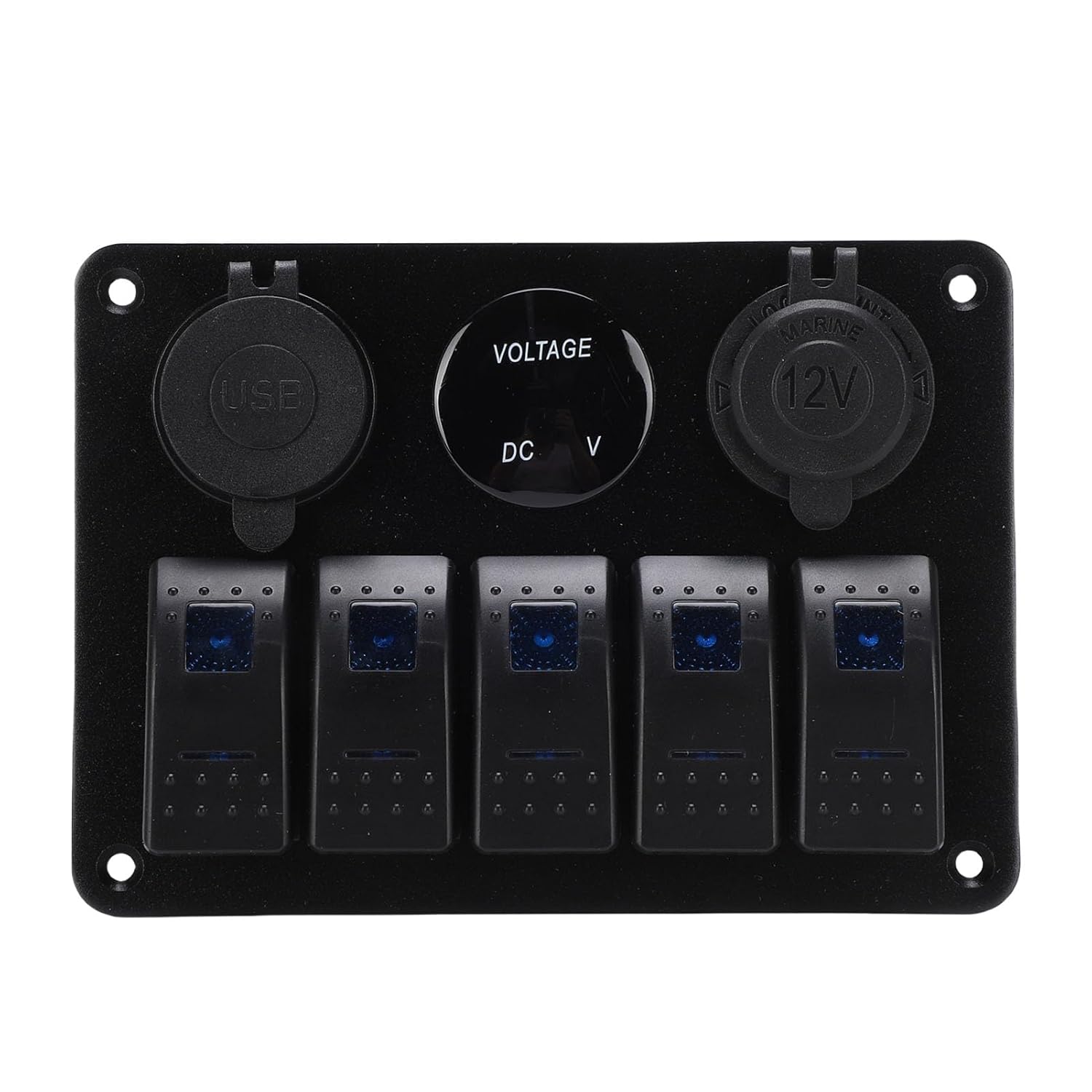 1. MULTI FUNCTIONAL: This 5 gang marine rocker switch panel combines practicality with convenience. It features dual USB charging ports for powering devices like smartphones and tablets on the go. Additionally, the built in voltage meter provides real time monitoring of circuit voltage. 2. RELIABLE AND ENDURING CONSTRUCTION: Crafted from aluminum materials, the rocker switches offer excellent conductivity, providing a smooth operation feel with every press, robust and sturdy shell, suitable for various vehicles and rough conditions. 3. WIDE COMPATIBILITY: Designed for marine use and compatible with cars, RVs, trucks, ideal for controlling lights, fans, inverters, navigation devices, enhancing vehicle circuit modifications and convenience. 4. ENHANCED VISIBILITY: The switch panel adopts a blue backlight design, allowing you to clearly identify the switch status even in dim environments, meeting the needs of power control in multiple scenarios. 5. PRACTICAL AND CONVENIENT: The switch not only looks stylish but also allows for easy operation, even while driving or navigating in a boat, bringing you sensitive and fast response, ensuring practicality and reliability. Specification: Item Type: 5 Gang Rocker Switch Applicable Types: Car Rv Truck Waterproofing Rating: IP65 USB Ports: 2 Material: Aluminum Voltage Meter: 1 Features: Equipped with 12V cigar lighter socket, voltage meter, and dual USB charging ports, with blue backlight for quick identification PackageList: 1 x Switch Panel 4 x Screws 2 x Stickers Note: