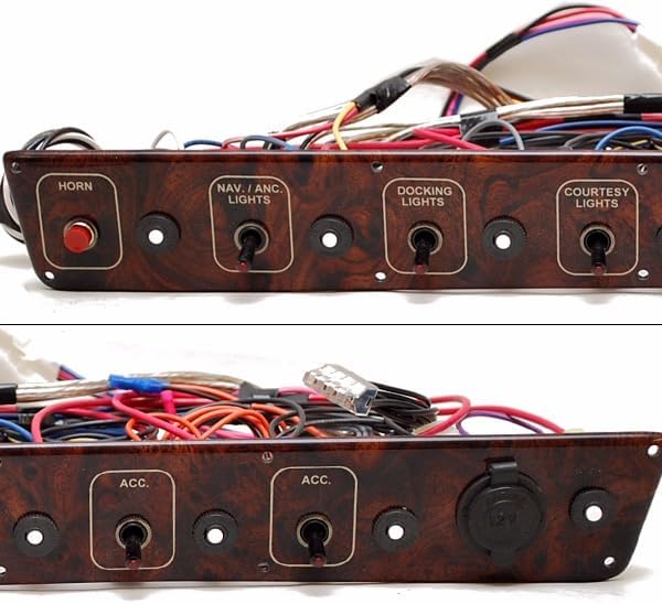 Boat part number 1040520 is a new old stock toggle switch panel from Misty Harbor Pontoons, part number unavailable . This panel is constructed out of marine grade plastic with a woodgrain pattern. Measures approximately 21 1/4" W (tapering to 20 1/4" W) x 2 1/2" H overall. Uses (1) 12-pin female and (1) 15-pin female connections and mounts with (1) 3/16" Dia. holes set around the perimeter.Features the following switches: (1) Push Button: "Horn"(1) Illuminated Toggle: On/Off/On "Nav Anc Lights"(1) Illuminated Toggle: On/Off "Docking Lights"(1) Illuminated Toggle: On/Off "Courtesy Lights"(2) Illuminated Toggle: On/Off "Acc"(1) 12V Power Receptacle(7) Push-to-Reset Breakers Specifications: Boat Manufacturer: Misty Harbor PontoonsColor: WoodgrainMaterial: Marine PlasticOverall Dimensions: 21 1/4" W (Tapering to 20 1/4" W) x 2 1/2" HConnections: (1) 12-Pin Female | (1) 15-Pin FemaleMounts: 3/16" Dia. Holes Set Around the PerimeterSold as seen in pictures. Customers please note every computer shows colors differently.All measurements are approximate.Hardware and instruction / installation manual not included.