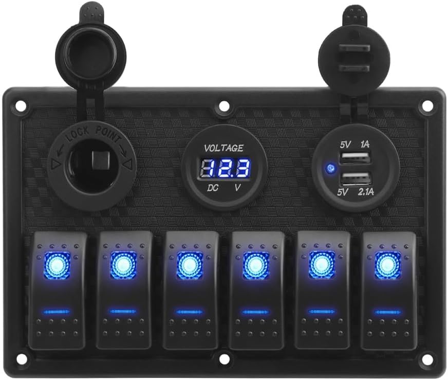 Standard:The rocker switch panel, slot waterproof cap, and sealing cap make it waterproof[3.1A (1A+2.1A) USB ports. Suitable for mobile phones ipad、 Various charging needs such as tablets, GPS, etc.Digital voltage display helps users monitor the electrical safety of machines.Suitable for 12V and 24V vehicles, such as trucks, jeeps, trailers, RVs, and other high-end large vehicles.Mechanical lifespan: 10000-20000 cyclesFunction: (S0016/S0016R/S0016O/S0018/S0018R/S0018O) with fuse, 12V power voltmeter, and USB socket3-digit voltmeter:Help users pay attention to voltage conditions and ensure equipment safetySwing arm switch:Loop circuit: on-offMaximum power: 240WInput voltage: DC12/24VProtection level: IP65Dual USB ports:Working voltage: 12-24VOutput current: 3.1AOutput voltage: 5VDo not confuse the cigarette lighter socket with a 12V charger.Working voltage: 12Output voltage: 12-24VColor: Blue/Red/GreenMaterial Science: ABSSize: See pictureThe packaging includes:1x 6 sets of joystick switch panels6x screws1x sticker