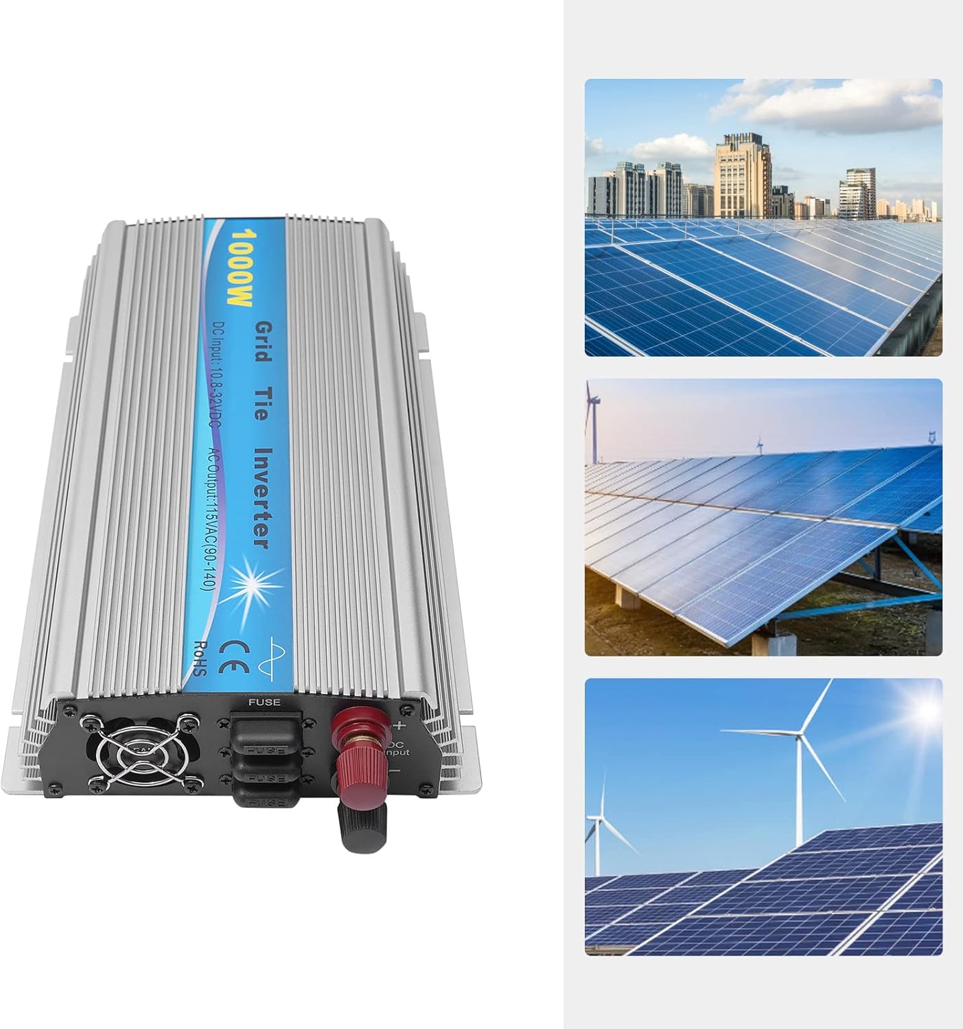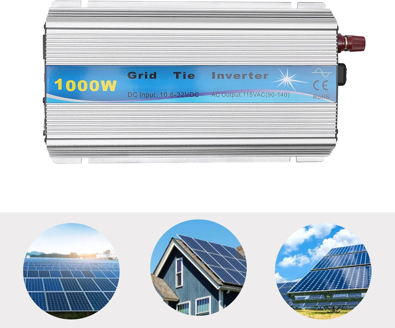 DescriptionThis grid tie inverter can effectively convert sunlight into clean green energy. It uses imported industrial electronic components, innovative MPPT technology and an isolated high-frequency transformer to make the efficiency higher than 99%, which is a more responsive, and higher output efficiency in photovoltaic power generation application systems. Its powerful output can effectively generate electricity for you.DetailsGaskets: The inverter is equipped with two gaskets to help you install the photovoltaic support, making the inverter more stable.Heat Dissipation Holes: The body has multiple heat dissipation holes, which help the machine to dissipate heat and enable it to run smoothly.ApplicationIt is very suitable for grid-connected power generation in schools, power stations and households. It is applicable to 18V solar panel and 24V battery.Specification Color: SilverModel: GTI1000WMaterial: Aluminium AlloyAC Output Power:1000WMaximum AC Output Power:1050WAC Output Voltage: 110V(AC 90V-140V)DC Input: DC10.8V-32VFrequency Range: 48- 62Hz(Self-adaption)MPPT Range 15.5-22VScope of Application: 18V Solar Panel and 24V BatteryPackage Size: 35*20*10cm/13.8*7.9*3.9inProduct Size: 21*16.5*5.3cm/10.6*6.5*2.1inGross Weight: 4kg/8.8lbsNet Weight: 3.5kg/7.7lbsPackage Included1*Grid Tie Inverter1 Set* English Manual1*Warranty Card1*Power CordAll Accessories for AssemblyNotes1. Please note that the input and output voltage must be within the voltage range of the product.2. Please note that the output port of the inverter must be connected to the household power grid socket (civil single-phase power grid) through an AC power line so that the product can work normally!3. Please note that the PV input power is recommended to be greater than 20% of the rated power of the product.4. Please note that the Vmp of the solar panel must be within the MPPT range to ensure the best MPPT maximum power output.5. We recommend using 18V photovoltaic panels (VOC voltage between 20-30V) or 24V batteries as input power to obtain better output power.6. Please note that the DC terminal must be tightened, otherwise, the product may be damaged.7. Please note that the grid tie inverter cannot be used as off grid/stand alone solar system. The output needs to be connected to the grid power. And it can not supply power directly to the AC loads.8. Please read the operating manual completely before use. And pay particular attention to the safety instructions included.9. Please allow the slight color difference caused by the shooting light and 1-3 cm error due to manual measurement, and make sure you do not mind before ordering.