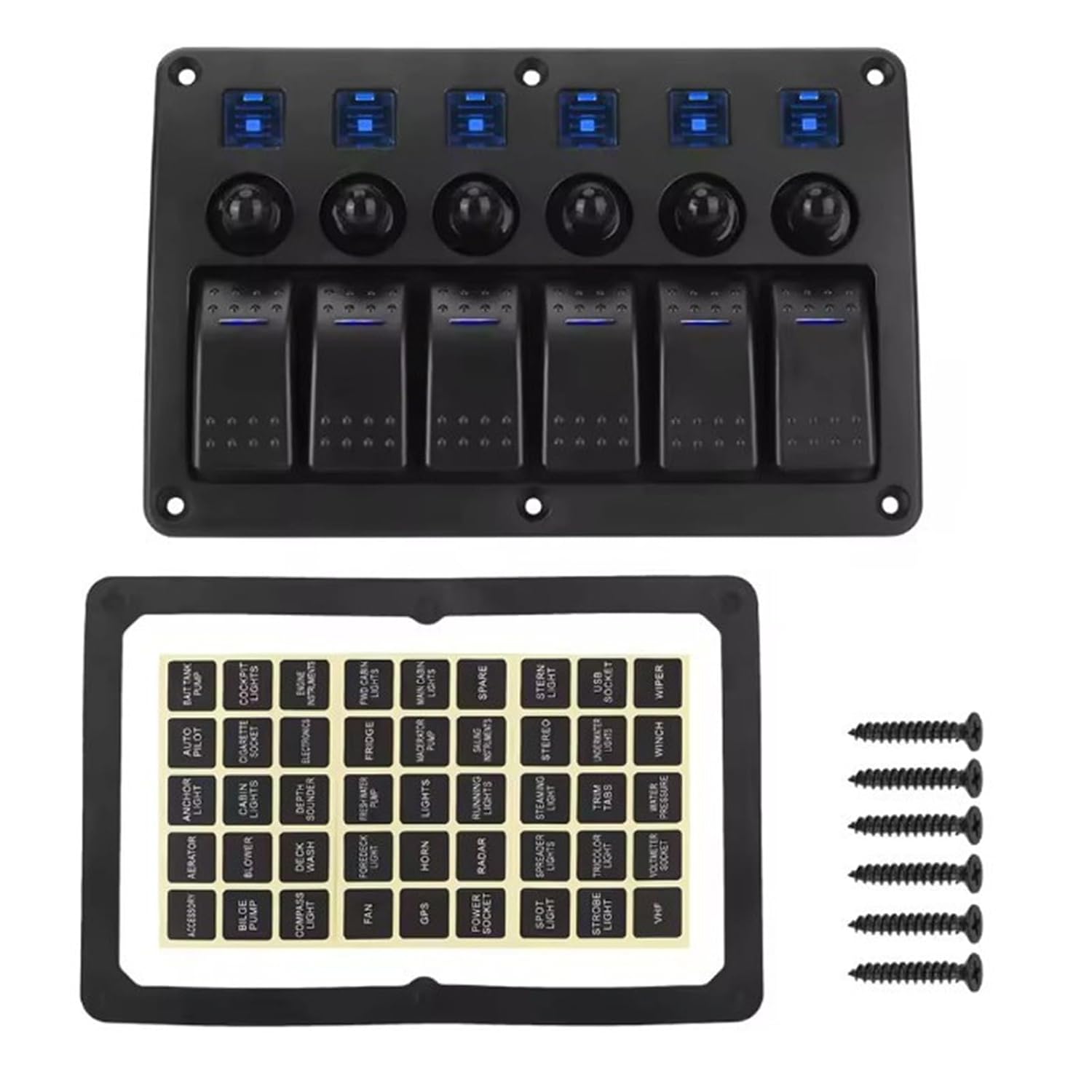 LED Lighted 6 Gang Rocker Switches Panel With Circuit Protector Overload For Car Boat UTV 12V 24V SystemsFeatures:Multifunction Use: This 6-position rocker switches panel operates with 12V-24V power systems, ideal for vehicles, vessels, and all-terrains vehicles, ensuring smooth functionality in environments.Strong Construction: Crafted from premium ABS and aluminum panel, this control panel provide excellent resistance to wear and tear, suitable for marine and automotive use.Overcurrent protections: Includes built-in overcurrent protections to safeguards your electrical setups from unexpected power surges, extending the life of your devices.Illuminated Design: Features LED backlighting for easy operations in dimly lightt areas, enhancing and convenience during nighttime usage.Customizable Labels: Comes with a set of labels for precise identification and customization of each control, allowing tailored functionality to meet specific requirements.Specifications:Component:ABSVoltages: DC12V-24V Operating current: 10 20ampsColor:Red,Blue,GreenSize:Approx.236mm/9.29''x121mm/4.76''Ensures that the power supply voltages is within the ranges of DC12V-24V, as exceeding this ranges may result in equipment damage.Package Includes:1Set 6 Gang Rocker Switches PanelNote:Please allow 1mm errors due to manual measurement. Due to the differences between different monitors, the picture may not reflect the actual color of the item.