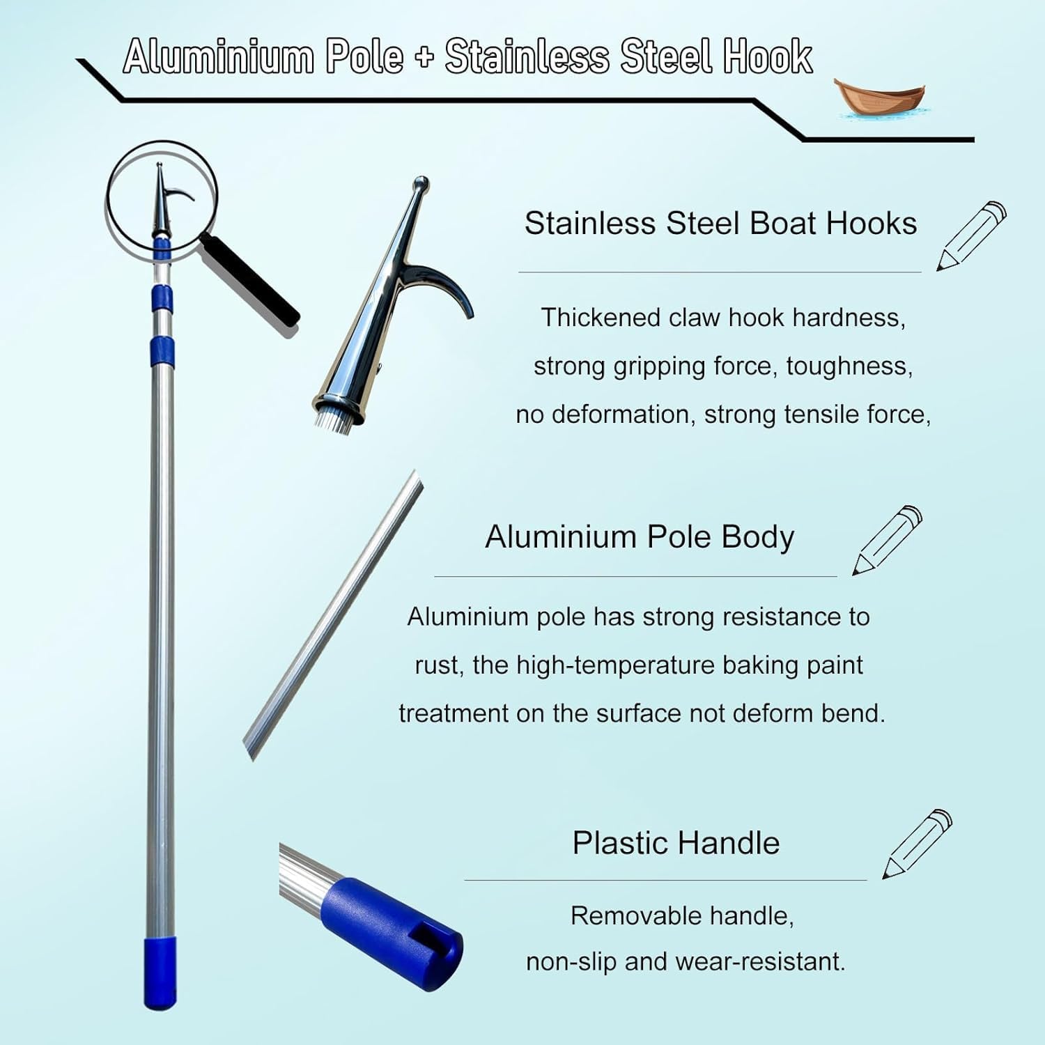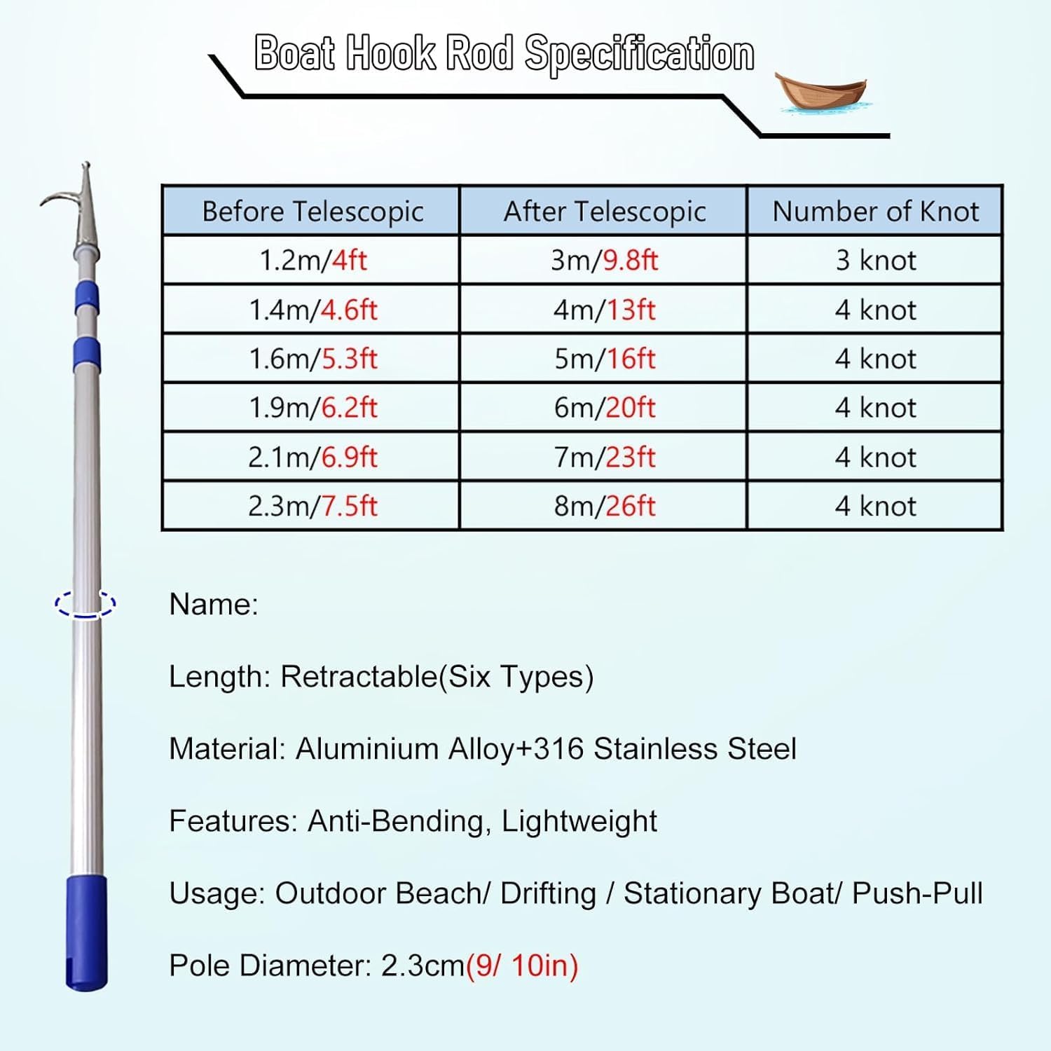 ------ Our boat hooks can play an important role as a tool in ship-related scenarios. When a ship is docked, the hooks can be used to hook onto shore fixtures, aid in cable tie-downs, and ensure that the ship is securely docked- Specifications1. Name: Boat Hook2. Material: Aluminum Pole + Stainless Steel Hook3. Pole Diameter: 2.3 cm(9/ 10 in)4. Length (Telescopic)- 1.2 m - 3 m/ 4 ft - 9.8 ft- 1.4 m - 4 m/ 4.6 ft - 13 ft- 1.6 m - 5 m/ 5.3 ft - 16 ft- 1.9 m - 6 m/ 6.2 ft - 20 ft- 2.1 m - 7 m/ 6.9 ft - 23 ft- 2.3 m - 8 m/ 7.5 ft - 26 ft5. Usage: Outdoor Beach/ Drifting/ Stationary Boat/ Push-Pull - Features1. It locks with a simple twist and the latch is very strong2. It's a handy tool for boats, pickups, or anywhere you need to reach3. The folded length is short enough to easily fit anywhere, and the extended length is large enough4. Not only can you reach items in the water, but you can also pull yourself to the dock when docking a boat alone5. The retractable pole can be used in close quarters to easily secure the boat to the dock, extending to reach ropes and objects farther out in the water- Includes:Boat Hook Pole- Warm Tips:1. There may be an error of 1-3 cm due to manual measurement2. Store the safety hook in a dry and safe place when not in use to maintain its quality and prolong its lifespan