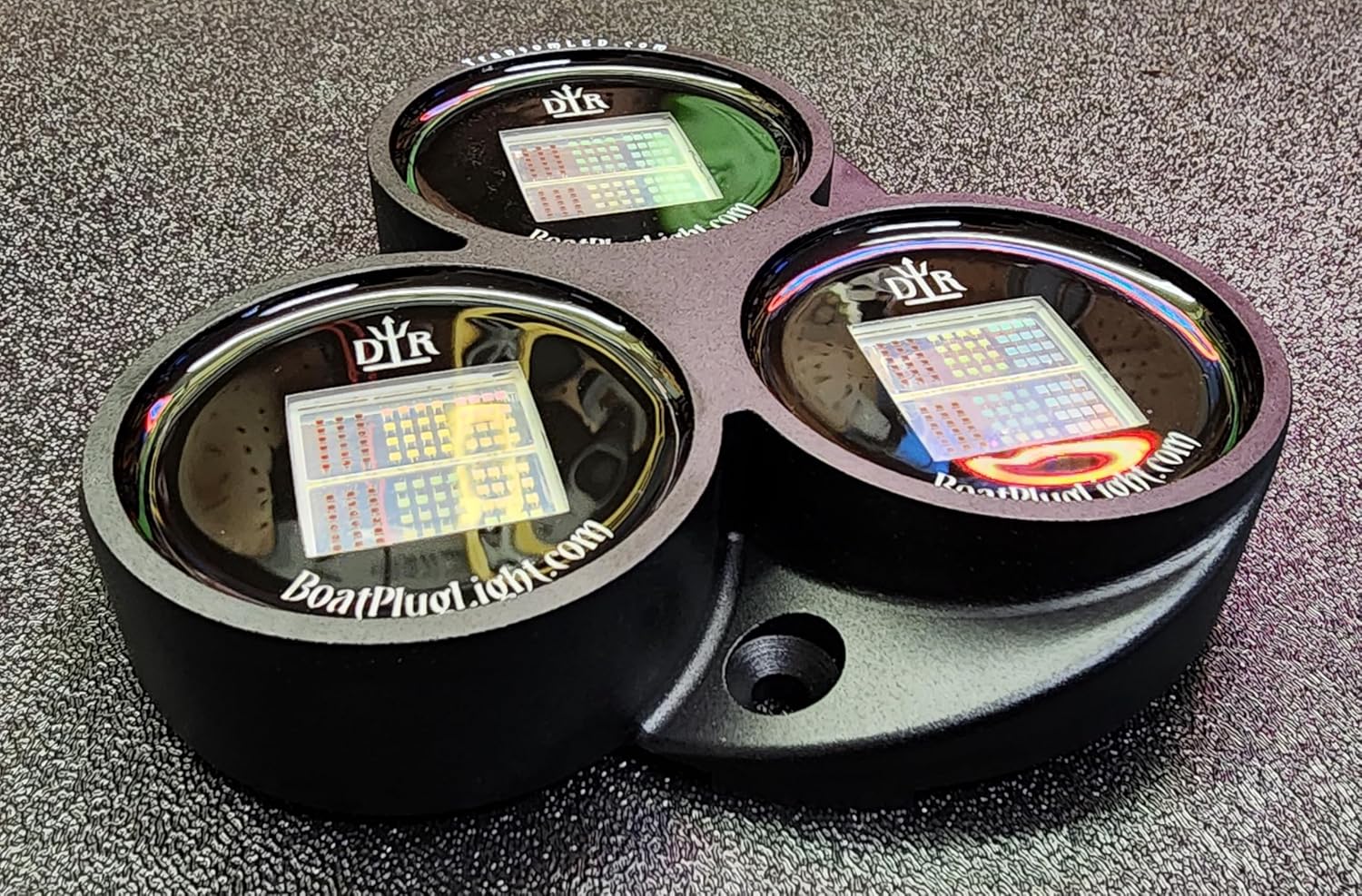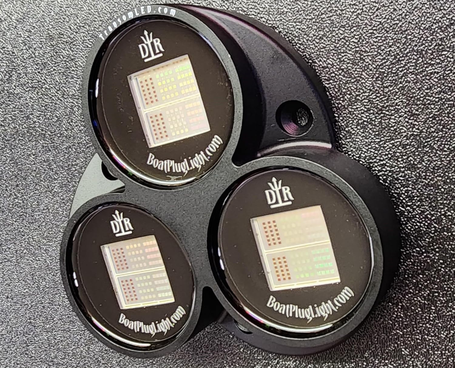 Brighter than any transom light that exists! Regardless of price! The Trinity surface mount transom light! 24,000 lumens total output power! Made of solid billet stainless steel! It can be ordered in any combination of colors available from our drop down list, just email us your configuration of choice. The LED's are encapsulated in industrial epoxy and carry a 50,000 hour life expectancy, nothing to fog up, nothing that could ever leak. The light comes with a mounting template, stainless screws and waterproof electronic LED driver. LED has a lifetime warranty. If you use this light in saltwater, apply TEFGEL to all fittings (available in our online store) This light is only 5" in diameter 12 to 24 volt input
