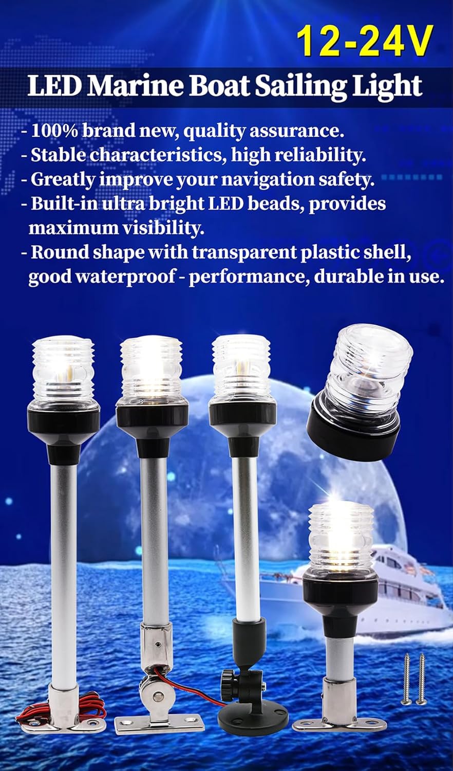 Specifications: Type: Navigation Boat Light Material: Base 316+aluminum pole+PC lampshade 6 inch product size: approx.153x66x52mm/6x2.6x2in 8 inch product size: approx.203x66x52mm/8x2.6x2in 10 inch product size: approx.254x66x52mm/10x2.6x2in 12 inch product size: approx.307x52x66mm/12.14x2.09x2.56in Rated power: 5W -Irradiation Angle: 360° Luminous type: always bright Maximum viewing distance: >2NM (2 nautical miles) Applicable hull scope: below 39.4 feet (12 meters) Voltage: DC12V-24V Start mode: external power control Light source: LED (33LED) Installation method: screw installation Waterproof grade: IP66 Wiring: Red wire to Positive, Black wire to Negative Installation Position: Any position such as bow, stern, side, mast, etc Scope of Application: Suitable for fishing boats, yachts, ships, marine Package List: 1 x Marine All Around Light 2 x Screw Note: 1.Please allow 0.1-0.5 inch difference due to manual measurement.(1 inch=2.54cm) 2.The color of the actual items may slightly different from the listing images due to different computer screen. 3.We provide clear pictures, measurements where possible. Please check as much as possible to make sure the item is the one that you need.