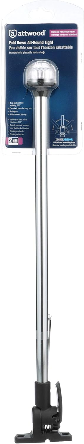 The all-round incandescent fold down navigation light 5350-PA20-7 has a black composite base. All Attwood All-Round Fold-Down Navigation Lights include a new durable, easy-to-use, easy-to-install LightArmorTM Fold-Down Base. It provides 2-mile, 360 degree, illumination for boats up to 12 meters/39.4 feet long. It also has an anti-glare lens to help preserve your night vision. Attwood Corporation has been an award-winning leader in engineering, testing, and manufacturing the highest quality marine products for over 100 years. We deliver safe and reliable lighting, fuel systems, water systems, seating & pedestals, swim ladders, custom upholstery, and general marine accessories that are easy to install and meet regulatory compliance.