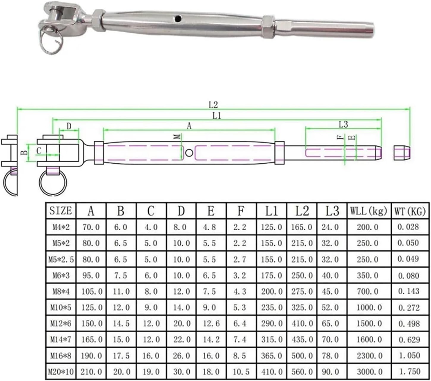 Product SpecificationMaterial: Stainless steel Surface: PolishSize: M4X2, M5X2,M6X3,M8X4Packing: 5pcs==========Size : M4X2, M5X2,M5X2.5,M6X3,M8X4Type : Threaded Swage Stud TerminalsMaterial : Stainless steelName : Jaw Swage TurnbuckleUse : Pontoon, Dock, Yacht, Kayak, SailboatFinish : PolishMaterial : SteelModel : Turnbuckle**Purchase Notes***Because it is manual measurement, please allow 1-3% error and make sure not to mind ordering.*Product photos are taken in kind, because the light is different from the display, so the color may be different. The product will be subject to the actual product received.