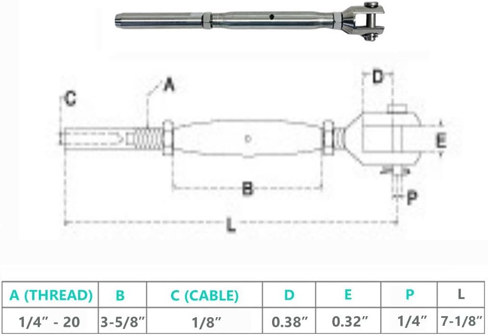 Fork & Hand Swage Stud TurnbuckleStainless Steel T316Hand SwageSize Thread: 1/4''-20Cable: 1/8''Turnbuckle Body Length: 3-5/8'' *Estimate Only*Overall Length (When Fully Tightened): 7-1/4'' *Estimate Only*Unit Weight: 2.93 Ounce *Estimate Only*Quantity: 1