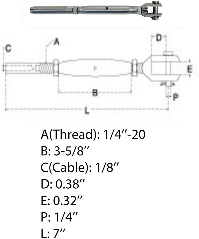 - Marine 1/4" Thread Fork & Swage Stud Turnbuckle 1/8" Cable Stainless Steel T316 4 Pcs - Material: Stainless Steel T316 - Size Thread: 1/4''-20 - Used For 1/8'' Cable - Turnbuckle Body Length: 3-5/8'' - Overall Length (When Fully Tightened): 7-1/4'' - Unit Weight: 3.07 Ounce - Quantity: 4 Pcs/Set