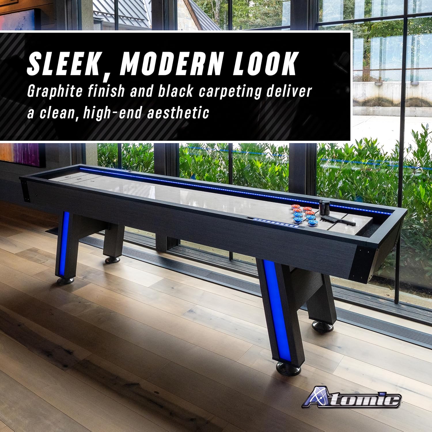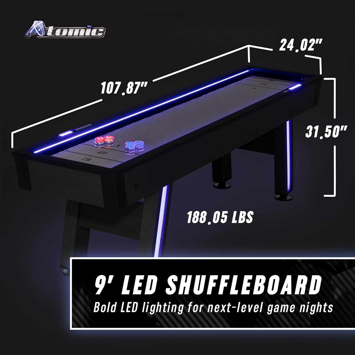 The Atomic 9' LED Shuffleboard Table combines a modern design with classic gaming features, offering an exciting addition to any game room. The table boasts bright LED accent lighting along the rails and legs, creating an eye-catching display for both shuffleboard and a bonus bowling game. Its sleek graphite construction with black carpet adds a contemporary touch to the aesthetic. Designed for smooth gameplay, the table includes shuffleboard powder to reduce friction and ensure a seamless experience. The set comes with all necessary accessories, including an AC adapter for the LED lights, ten bowling pins, a pin setter, a surround to prevent pins from falling off the table, and eight chrome metal weighted pucks for shuffleboard. Enjoy two games in one with this versatile and stylish table.
