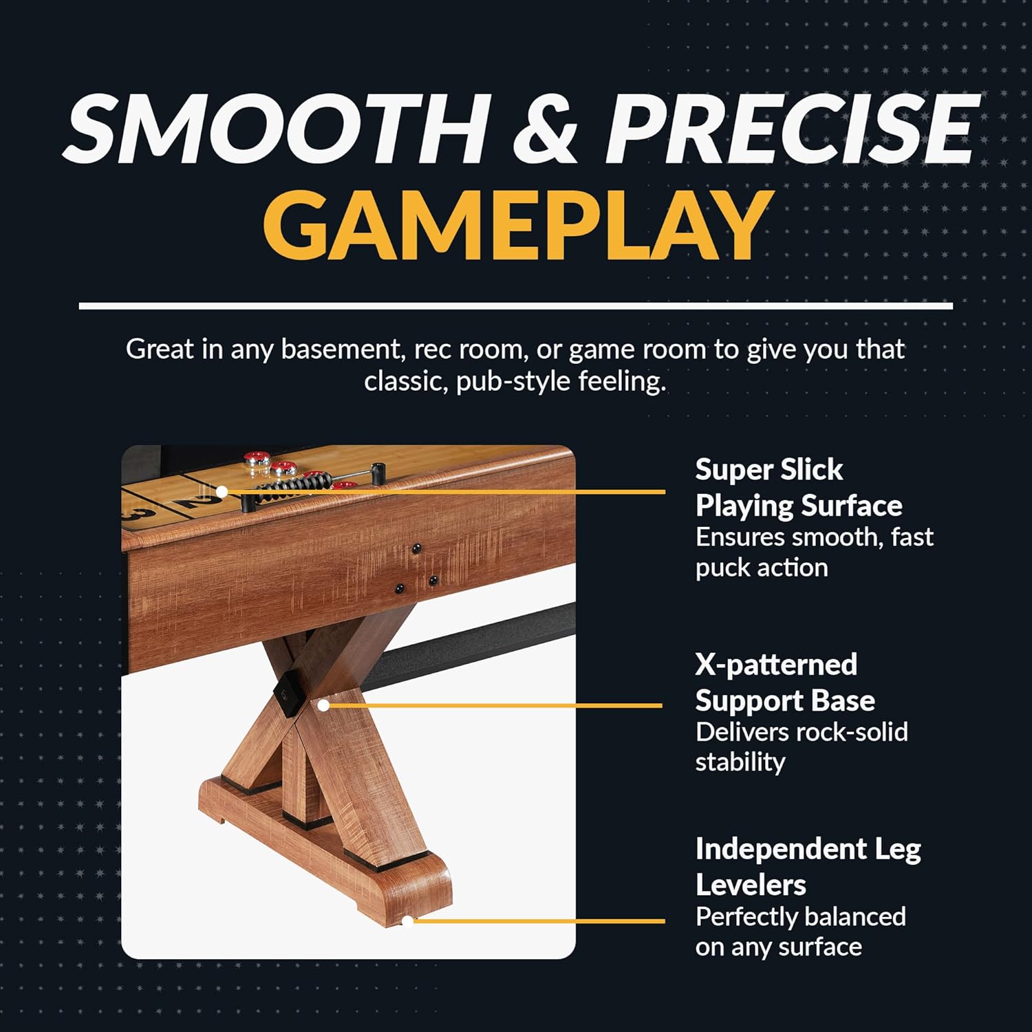 The Hathaway Daulton 9 Ft Shuffleboard Table delivers a balance of sleek industrial design and professional-grade gameplay for any arcade game room or family entertainment space. Crafted with a strong MDF cabinet finished in an urban white oak melamine and accented with black metal details, it brings contemporary character into the home. This shuffle board game table is sized at 108-in L x 24.25-in W x 30-in H and includes a 1-in thick engineered wood playfield coated in poly for smooth puck action. The playfield itself measures 96-in L x 14-in W and is supported by a 2-in diameter steel bar beneath the surface for enhanced strength and balance. Designed with long-lasting play in mind, this indoor shuffleboard table features a rugged X-pattern trestle base made of durable engineered wood, complete with hidden leg levelers to ensure a stable and even playing surface on any flooring type. Black carpeted gutters line the playfield, helping to absorb sound for a quieter match and more focused play. Its manual slide scoring system allows players to track games easily without digital interference, making it ideal for classic gameplay in a game room setting. Though built for at-home use, its size and structure rival tables seen in public venues, making it a versatile piece for both casual and serious players. Included with the hathaway shuffleboard table is a full shuffle board set, featuring four red pucks, four blue pucks, a table brush, and a can of wax to maintain optimal play conditions. With an overall weight of 202 lbs, this home shuffleboard table provides substantial durability. Assembly is required and takes approximately 60 minutes using a Philips head screwdriver. Engineered for family enjoyment and lasting performance, the Daulton stands out among premium shuffleboard tables as a striking and reliable addition to any game table lineup. Ideal for enthusiasts looking to enhance their shuffle board skills in a stylish, dedicated shuffleboard table for home setup.