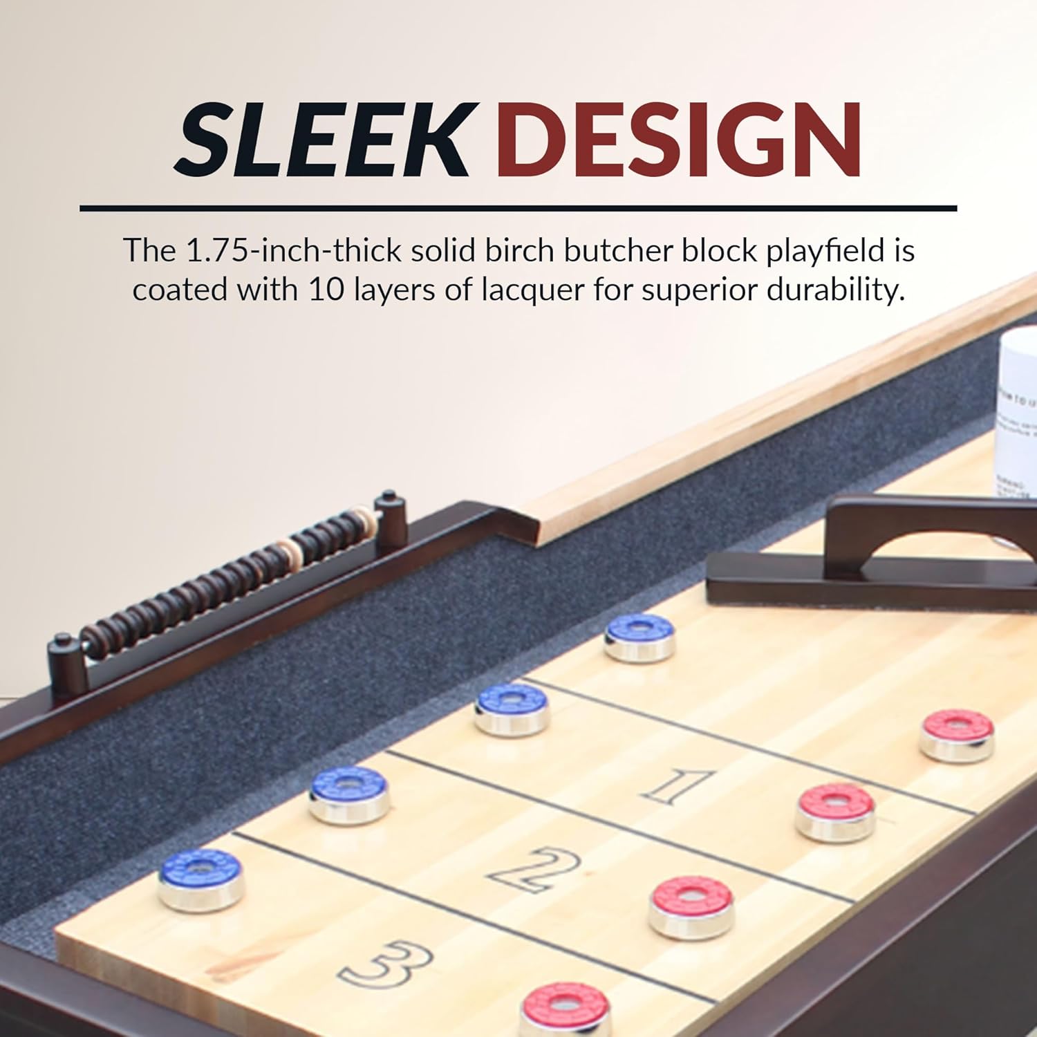 Elevate your game room with a timeless classic the whole family will enjoy. The Hathaway Merlot Shuffleboard Table 12 ft brings together elegant design and top-tier craftsmanship for an unmatched playing experience. Built from solid hardwood and hardwood veneer, its rich finish and sturdy construction make it a stunning centerpiece in any recreational space. At the heart of the Merlot 12 Shuffleboard Table is a 1.75-in thick, solid birch butcher block playfield—precision-coated with 10 layers of lacquer to create a sleek, glossy surface that ensures smooth, fast puck action. Whether you're hosting a tournament or enjoying casual family fun, this durable surface holds up beautifully through endless games. Stability is never in question thanks to the 1-in thick solid wood side and end aprons, designed to eliminate wobble and enhance structural integrity. Reinforced, double-paneled legs add extra strength, while 1.5-in leg levelers let you achieve a perfectly balanced setup on any floor. With three built-in climate adjusters, you can fine-tune your playfield to maintain consistent conditions regardless of temperature or humidity. Thoughtful touches like carpet-lined sidewalls and EVA-padded gutters not only reduce noise but also protect your pucks and table edges during intense matches. Every detail is engineered to provide a smooth, quiet, and enjoyable game. The Merlot Shuffle Board Game Table 12 Ft comes complete with everything you need to play: four red and four blue shuffleboard pucks, two abacus scorers, one table brush, and a can of table wax. It’s all backed by a 180-day limited warranty, giving you confidence in a table built for years of fun-filled competition.
