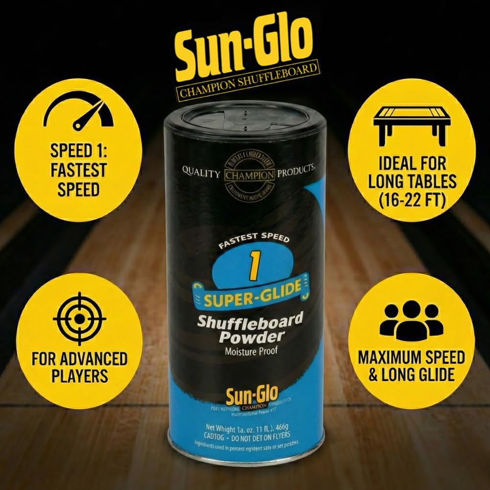 Sun-Glo #1 Super Glide Shuffleboard Powder is the fastest speed powder in the Sun-Glo lineup, engineered for advanced players and long table gameplay. Trusted since 1935, Sun-Glo has been the industry leader in shuffleboard products, delivering quality and performance that professionals and enthusiasts rely on. Crafted from premium silicone beads, #1 Super Glide provides a friction-free, consistent slide while protecting your table surface. The fine, uniform powder spreads evenly for reliable performance and superior speed control. Its fast glide allows pucks to travel greater distances with minimal effort, making it ideal for professional tournament tables and home game rooms alike. Recommended for 16–22 ft tables, bar tables, and tournament settings, this powder is perfect for players seeking high-speed performance and precision sliding. Elevate your shuffleboard experience with Sun-Glo #1 Super Glide – smooth, fast, and ready for competitive play.