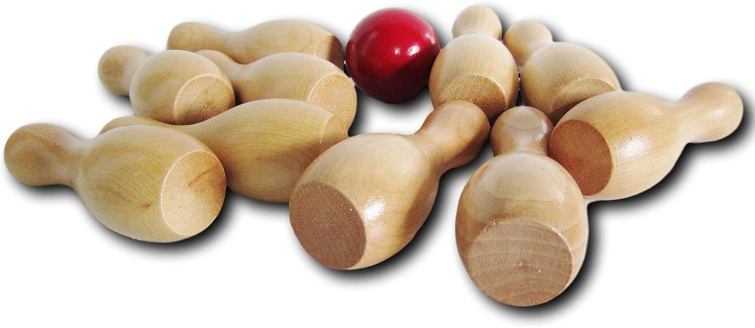 Bring classic style and skillful fun to your tabletop with this Wooden Shuffleboard Bowling Pin Set with Red Ball — a beautifully crafted mini bowling set made for shuffleboard enthusiasts, hobbyists, and décor lovers alike. Each piece is made from solid wood and lightly varnished to highlight the natural grain and warm tone. The set includes 10 miniature bowling pins (3.81" tall) and a 1.75" red wooden ball, creating a compact, high-quality accessory for tabletop bowling, shuffleboard scoring games, or rustic game room décor. Because each pin is hand-turned and finished, no two sets are exactly alike — giving yours authentic charm and craftsmanship. It’s a great addition to any home bar, office desk, or shuffleboard setup, adding a touch of playful sophistication wherever it’s displayed. Recommended Age Range: Suitable for ages 14 years and older. Designed as a tabletop game accessory and decorative display for teens and adults.