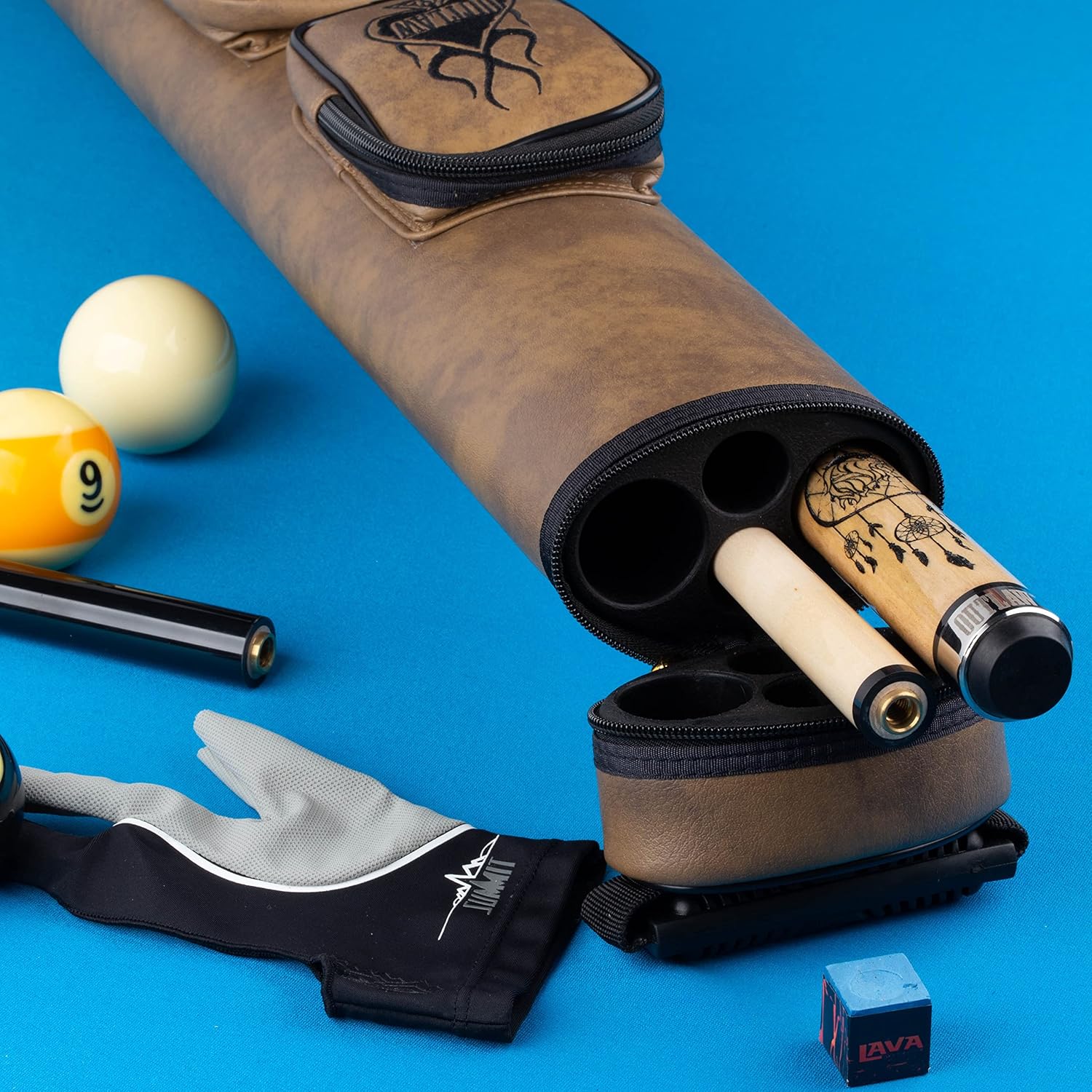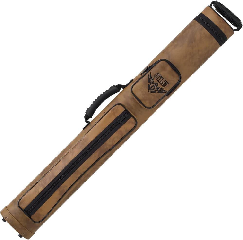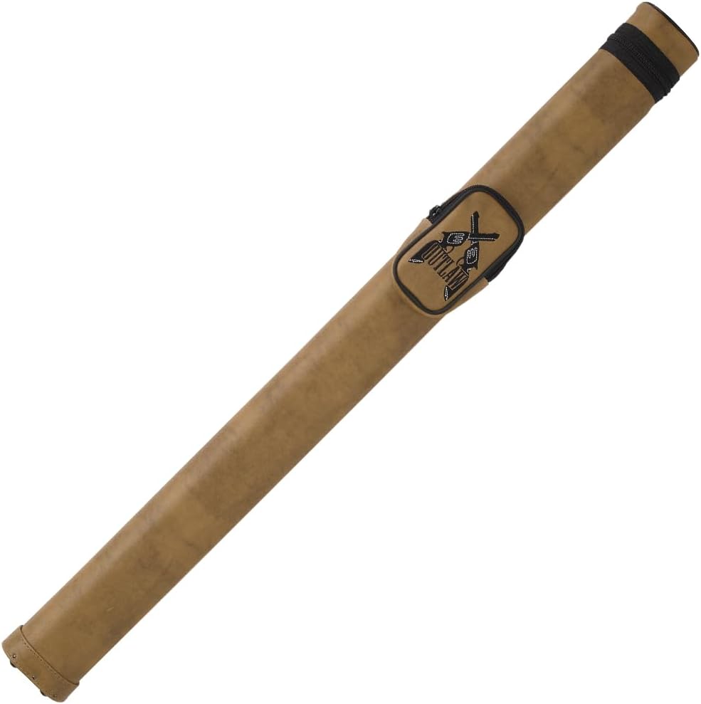1 butt and 1 shaft hard tube case. Available with either a flames, guns, horseshoe or wings designs embroidered into the smaller pocket. Pockets: 1, 6 Inch in length. Sewn in padded shoulder strap and an additional carrying handle. Interior Length- Fits up to 31" shaft. Interior Lining: Black cloth over tubes . Interior Structure: Poured rubber mold casing. Shafts insert tip down, butt can be inserted in any direction.