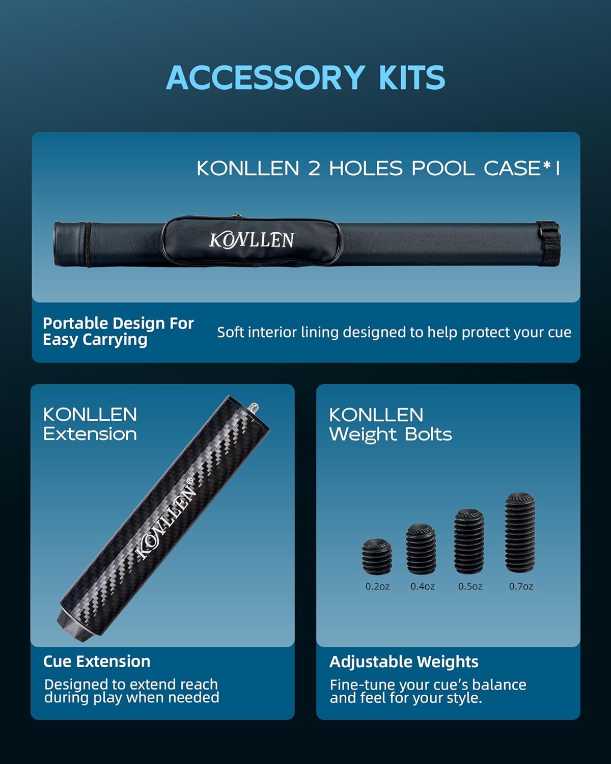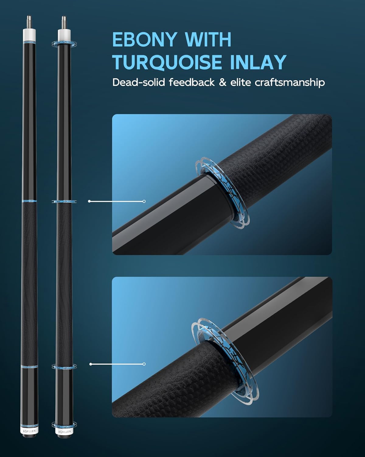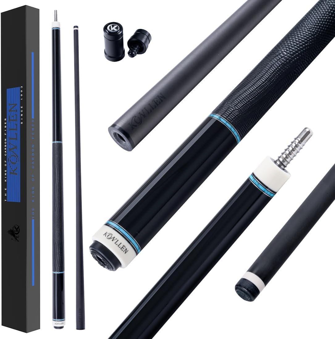 KONLLEN 2.0 Carbon Fiber Pool Cue – Low Deflection Pro Taper Shaft, 58", 12.5mm / 11.8mm, Radial Pin Joint, Real Ebony Inlay
