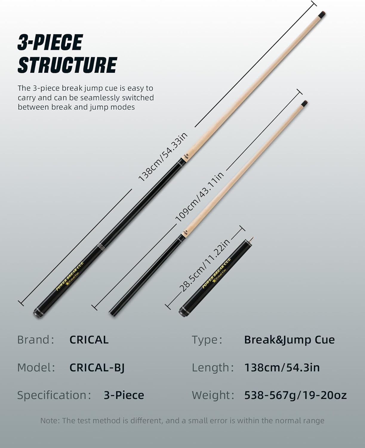 CRICAL Break Jump Cue delivers explosive power with its hard maple construction and 13.5mm Bakelite tip for crushing breaks. The innovative dual quick-release joints enable instant conversion between 54.3-inch break mode and 43-inch jump configuration. Featuring a wrapless maple grip for superior control and available in multiple colors, this professional cue combines durability with versatile performance. The shorter break length and reinforced ferrule ensure maximum power transfer, making it ideal for players seeking reliable break-and-jump capability in one premium package